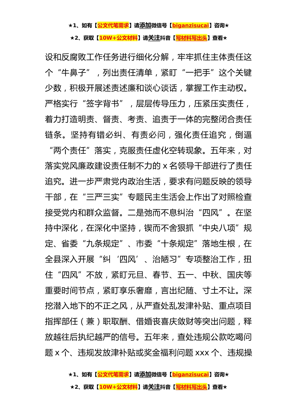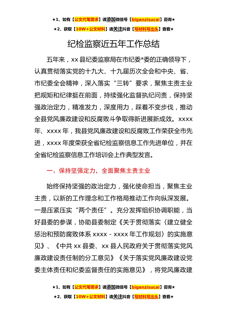 ★1、如有【公文代笔需求】请添加微信号【biganzisucai】咨询★★2、获取【10W+公文材料】请关注抖音【写材料写出头】查看★纪检监察近五年工作总结五年来,xx县纪委监察局在市纪委*委的正确领导下,认真贯彻落实党的十九大、十九届历次全会和中央、省、市纪委全会精神,深入落实“三转”要求,聚焦主责主业把规矩和纪律挺在前面,持续强化监督执纪问责,保持坚强政治定力,精准发力,深度用力,踩着不变步伐,推动全县党风廉政建设和反腐败斗争取得新进展新成效。xxxx年、xxxx年,我县党风廉政建设和反腐败工作荣获全市先进,xxxx年度荣获全省纪检监察信息工作先进单位,并在全省纪检监察信息工作培训会上作典型发言。一、保持坚强定力,全面聚焦主责主业始终保持坚强的政治定力,强化使命担当,聚焦主业主责,以...