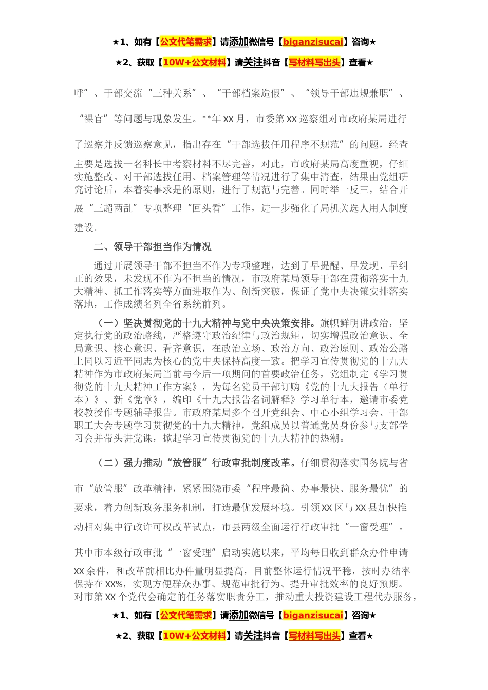 ★1、如有【公文代笔需求】请添加微信号【biganzisucai】咨询★★2、获取【10W+公文材料】请关注抖音【写材料写出头】查看★根据市委组织部《关于当好迎接选人用人专项巡视检查的通知》要求,市政府某局仔细开展选人用人工作自查自纠,并延伸开展领导干部六次方面的担当作为情况自查。现将具体情况汇报如下:一、选人用人工作情况**年X月接受上级干部选拔任用工作巡视检查以来,市政府某局快速查漏补缺,扎实开展问题整改,并仔细根据有关文件要求,着力健全完善长效机制,营造了风清气正的选人用人环境,无一例违规违纪问题发生。(一)严格按规定选拔配备干部。**年以来,市政府某局科级干部选拔任用工作严格根据《党政领导干部选拔任用工作条例》与《全市市级部门科级领导干部选拔任用与管理办法》规定程序组织...
