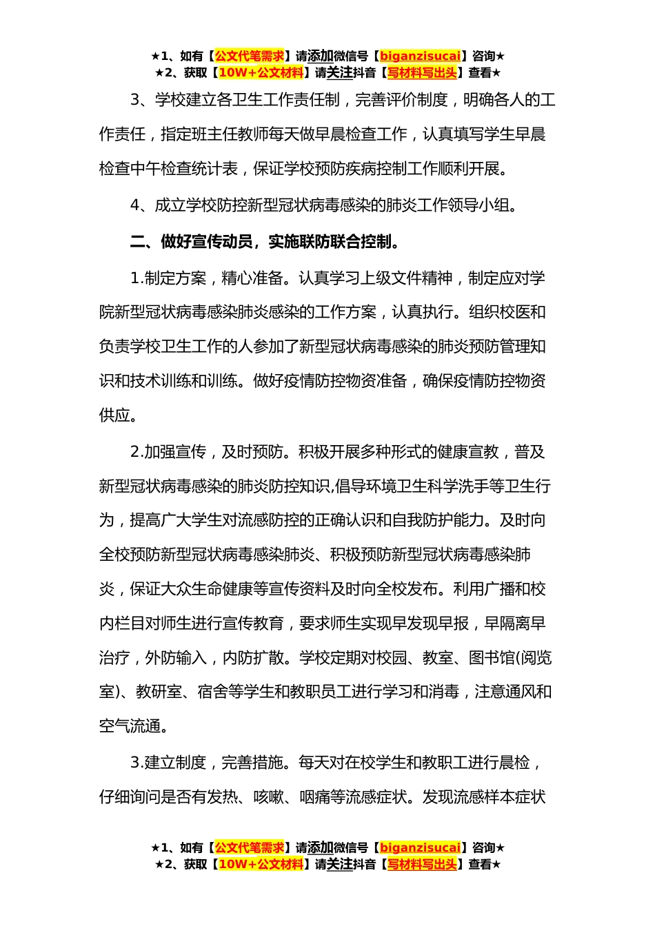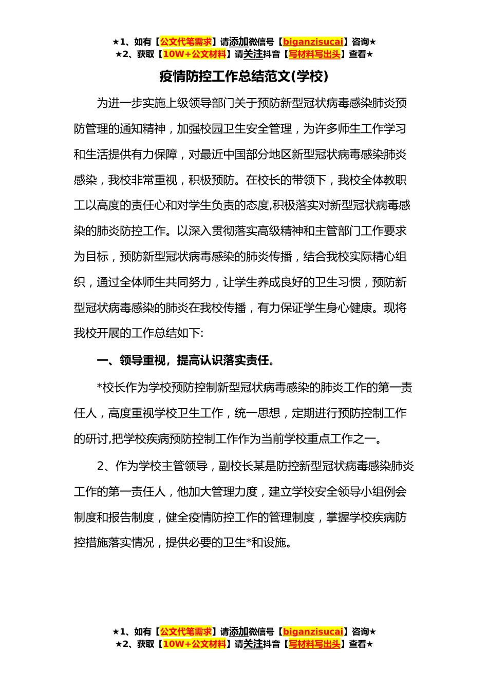 ★1、如有【公文代笔需求】请添加微信号【biganzisucai】咨询★★2、获取【10W+公文材料】请关注抖音【写材料写出头】查看★疫情防控工作总结范文(学校)为进一步实施上级领导部门关于预防新型冠状病毒感染肺炎预防管理的通知精神,加强校园卫生安全管理,为许多师生工作学习和生活提供有力保障,对最近中国部分地区新型冠状病毒感染肺炎感染,我校非常重视,积极预防。在校长的带领下,我校全体教职工以高度的责任心和对学生负责的态度,积极落实对新型冠状病毒感染的肺炎防控工作。以深入贯彻落实高级精神和主管部门工作要求为目标,预防新型冠状病毒感染的肺炎传播,结合我校实际精心组织,通过全体师生共同努力,让学生养成良好的卫生习惯,预防新型冠状病毒感染的肺炎在我校传播,有力保证学生身心健康。现将我...