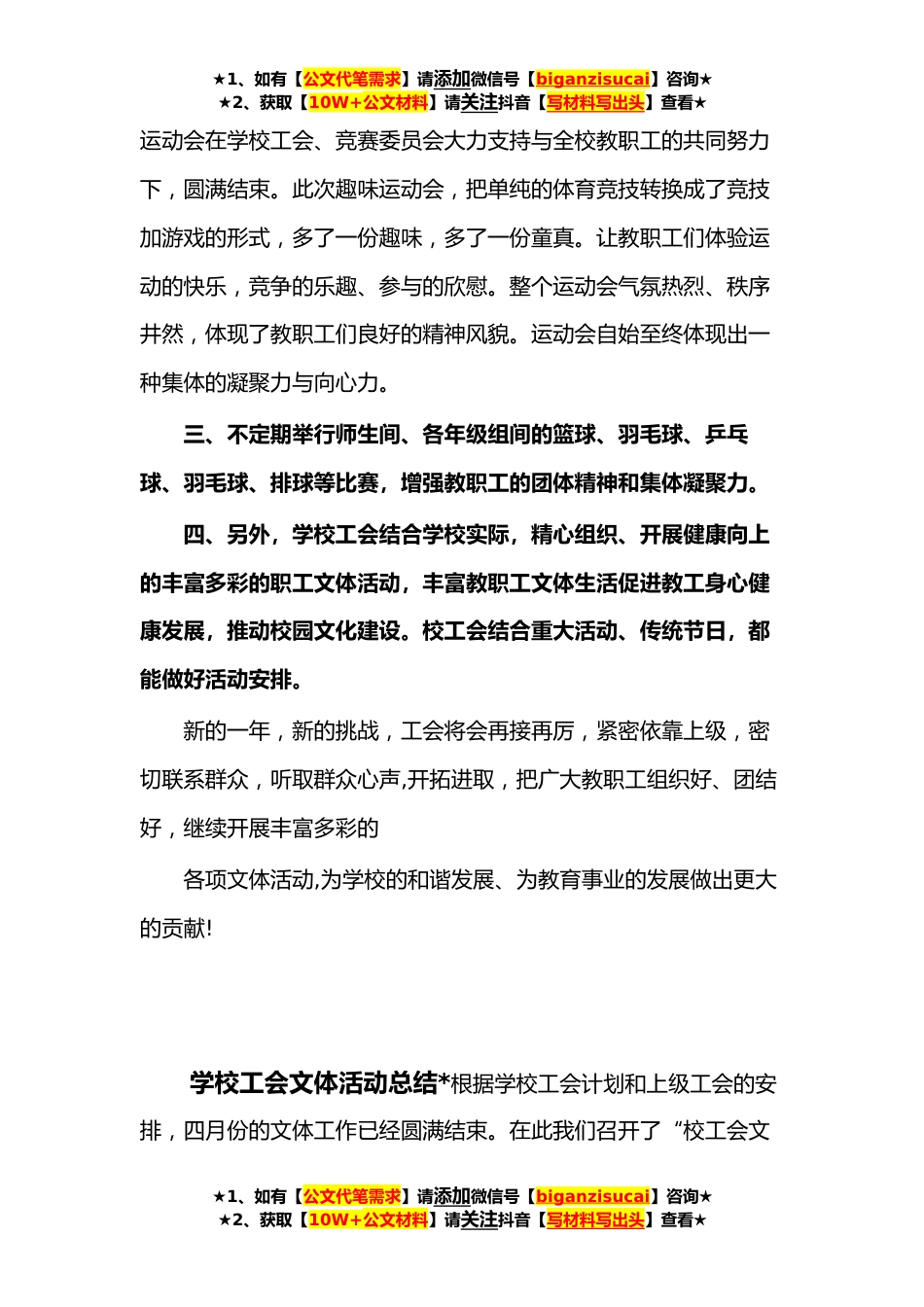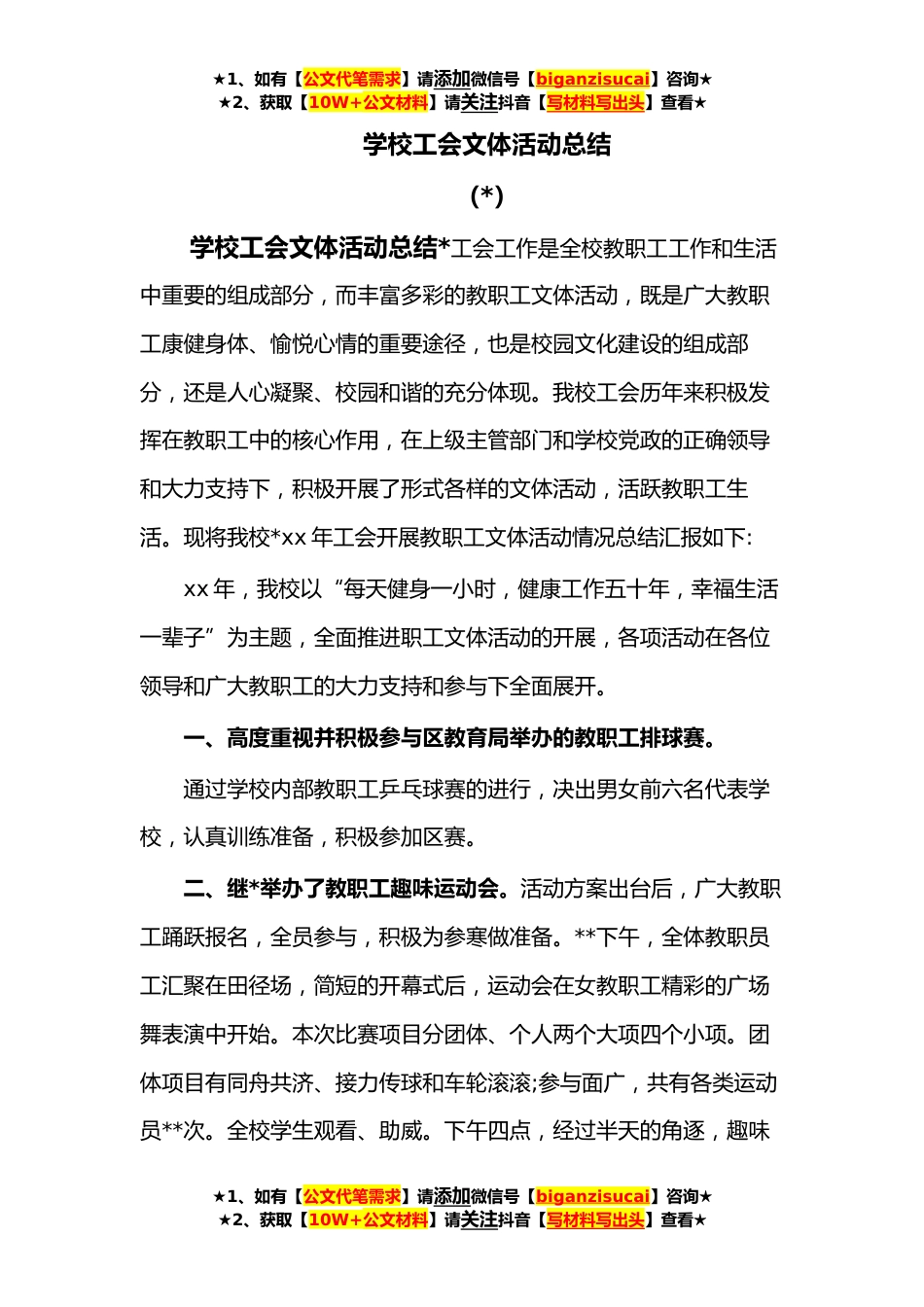 ★1、如有【公文代笔需求】请添加微信号【biganzisucai】咨询★★2、获取【10W+公文材料】请关注抖音【写材料写出头】查看★学校工会文体活动总结(*)学校工会文体活动总结*工会工作是全校教职工工作和生活中重要的组成部分,而丰富多彩的教职工文体活动,既是广大教职工康健身体、愉悦心情的重要途径,也是校园文化建设的组成部分,还是人心凝聚、校园和谐的充分体现。我校工会历年来积极发挥在教职工中的核心作用,在上级主管部门和学校党政的正确领导和大力支持下,积极开展了形式各样的文体活动,活跃教职工生活。现将我校*xx年工会开展教职工文体活动情况总结汇报如下:xx年,我校以“每天健身一小时,健康工作五十年,幸福生活一辈子”为主题,全面推进职工文体活动的开展,各项活动在各位领导和广大教职工...