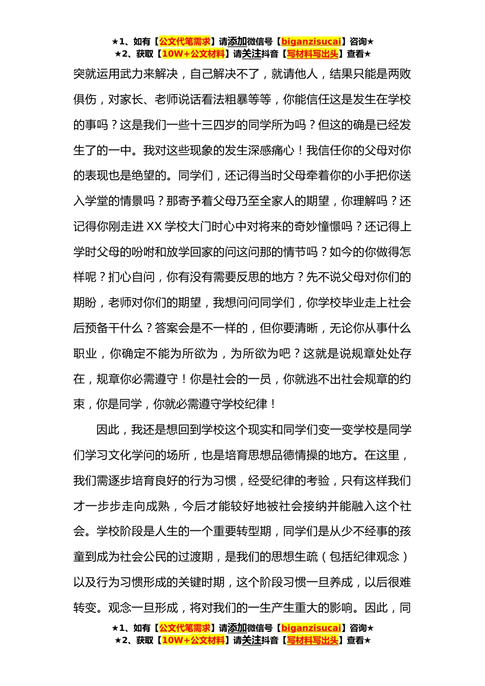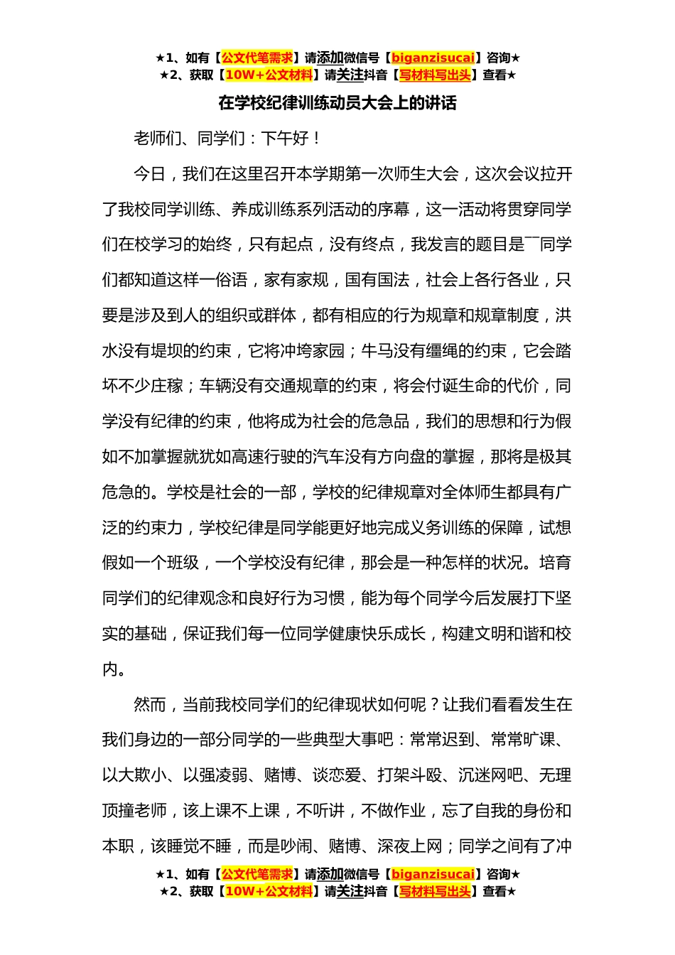 ★1、如有【公文代笔需求】请添加微信号【biganzisucai】咨询★★2、获取【10W+公文材料】请关注抖音【写材料写出头】查看★在学校纪律训练动员大会上的讲话老师们、同学们:下午好!今日,我们在这里召开本学期第一次师生大会,这次会议拉开了我校同学训练、养成训练系列活动的序幕,这一活动将贯穿同学们在校学习的始终,只有起点,没有终点,我发言的题目是――同学们都知道这样一俗语,家有家规,国有国法,社会上各行各业,只要是涉及到人的组织或群体,都有相应的行为规章和规章制度,洪水没有堤坝的约束,它将冲垮家园;牛马没有缰绳的约束,它会踏坏不少庄稼;车辆没有交通规章的约束,将会付诞生命的代价,同学没有纪律的约束,他将成为社会的危急品,我们的思想和行为假如不加掌握就犹如高速行驶的汽车...
