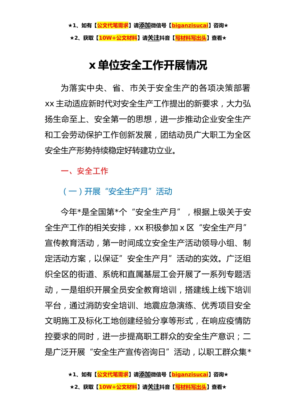 ★1、如有【公文代笔需求】请添加微信号【biganzisucai】咨询★★2、获取【10W+公文材料】请关注抖音【写材料写出头】查看★x单位安全工作开展情况为落实中央、省、市关于安全生产的各项决策部署xx主动适应新时代对安全生产工作提出的新要求,大力弘扬生命至上、安全第一的思想,进一步推动企业安全生产和工会劳动保护工作创新发展,团结动员广大职工为全区安全生产形势持续稳定好转建功立业。一、安全工作(一)开展“安全生产月”活动今年*是全国第*个“安全生产月”,根据上级关于安全生产工作的相关安排,xx积极参加x区“安全生产月”宣传教育活动,第一时间成立安全生产活动领导小组、制定活动方案,以保证”安全生产月”活动的实效。广泛组织全区的街道、系统和直属基层工会开展了一系列专题活动,一是组织...