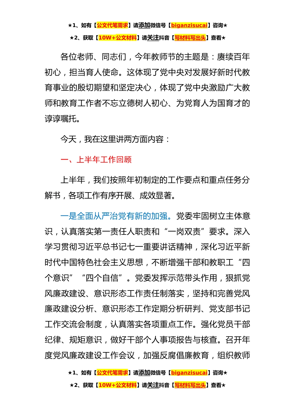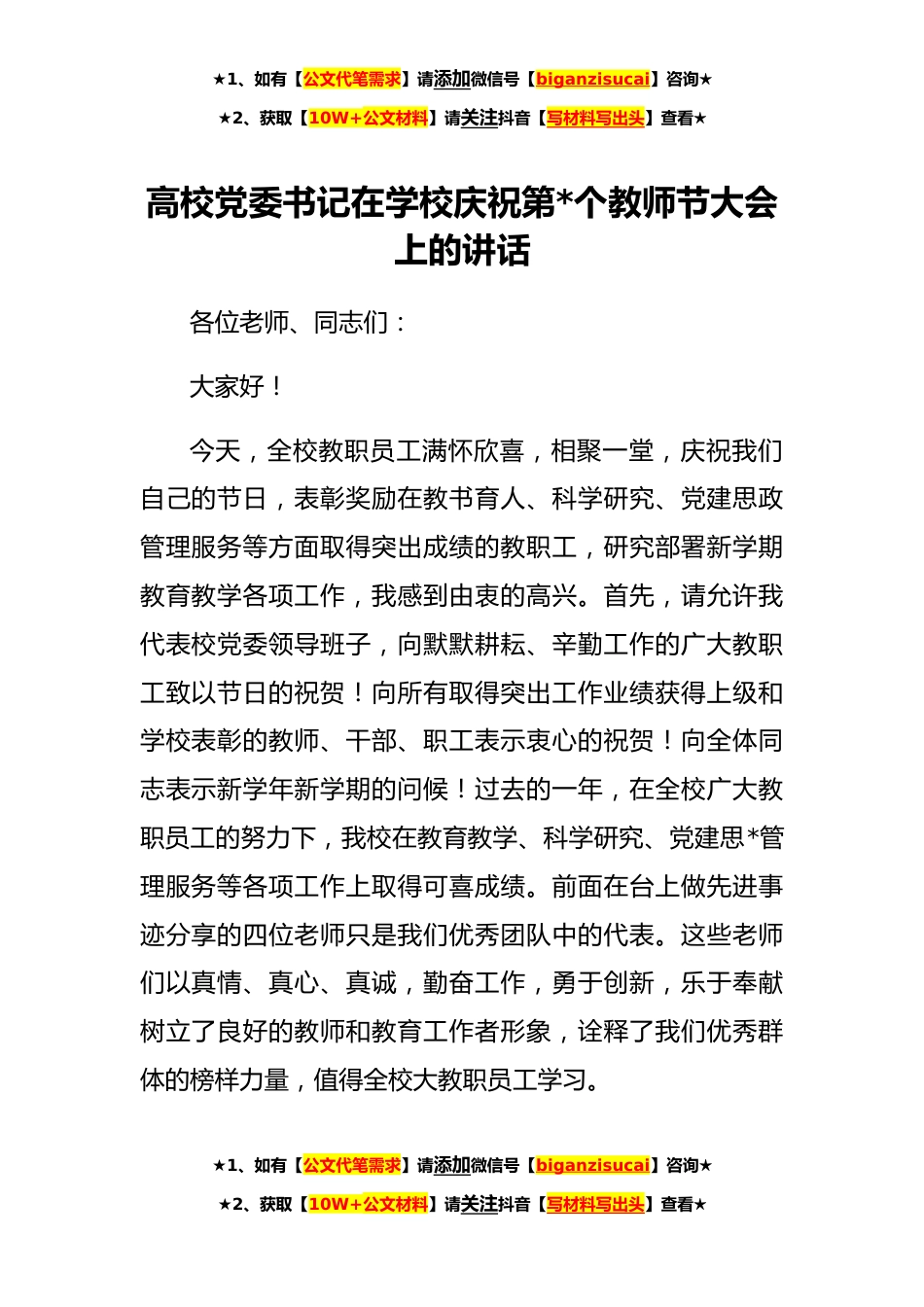 ★1、如有【公文代笔需求】请添加微信号【biganzisucai】咨询★★2、获取【10W+公文材料】请关注抖音【写材料写出头】查看★高校党委书记在学校庆祝第*个教师节大会上的讲话各位老师、同志们:大家好!今天,全校教职员工满怀欣喜,相聚一堂,庆祝我们自己的节日,表彰奖励在教书育人、科学研究、党建思政管理服务等方面取得突出成绩的教职工,研究部署新学期教育教学各项工作,我感到由衷的高兴。首先,请允许我代表校党委领导班子,向默默耕耘、辛勤工作的广大教职工致以节日的祝贺!向所有取得突出工作业绩获得上级和学校表彰的教师、干部、职工表示衷心的祝贺!向全体同志表示新学年新学期的问候!过去的一年,在全校广大教职员工的努力下,我校在教育教学、科学研究、党建思*管理服务等各项工作上取得可喜成...