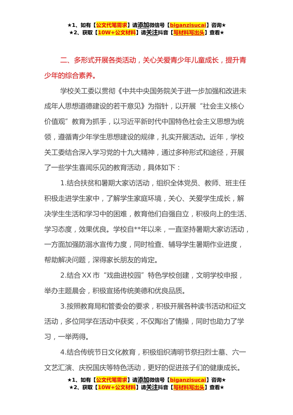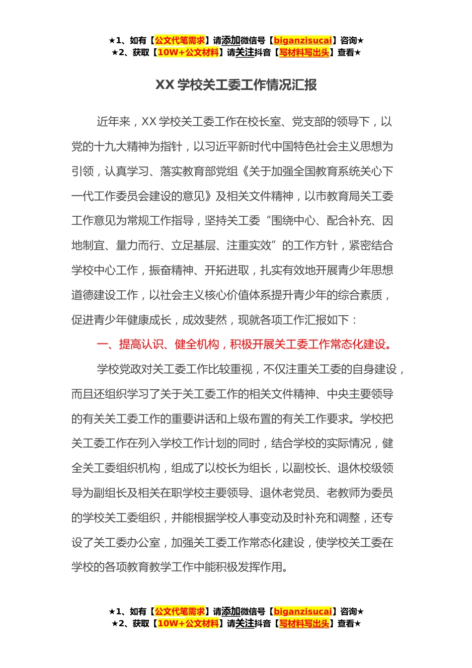 ★1、如有【公文代笔需求】请添加微信号【biganzisucai】咨询★★2、获取【10W+公文材料】请关注抖音【写材料写出头】查看★XX学校关工委工作情况汇报近年来,XX学校关工委工作在校长室、党支部的领导下,以党的十九大精神为指针,以习近平新时代中国特色社会主义思想为引领,认真学习、落实教育部党组《关于加强全国教育系统关心下一代工作委员会建设的意见》及相关文件精神,以市教育局关工委工作意见为常规工作指导,坚持关工委“围绕中心、配合补充、因地制宜、量力而行、立足基层、注重实效”的工作方针,紧密结合学校中心工作,振奋精神、开拓进取,扎实有效地开展青少年思想道德建设工作,以社会主义核心价值体系提升青少年的综合素质,促进青少年健康成长,成效斐然,现就各项工作汇报如下:一、提高认识...