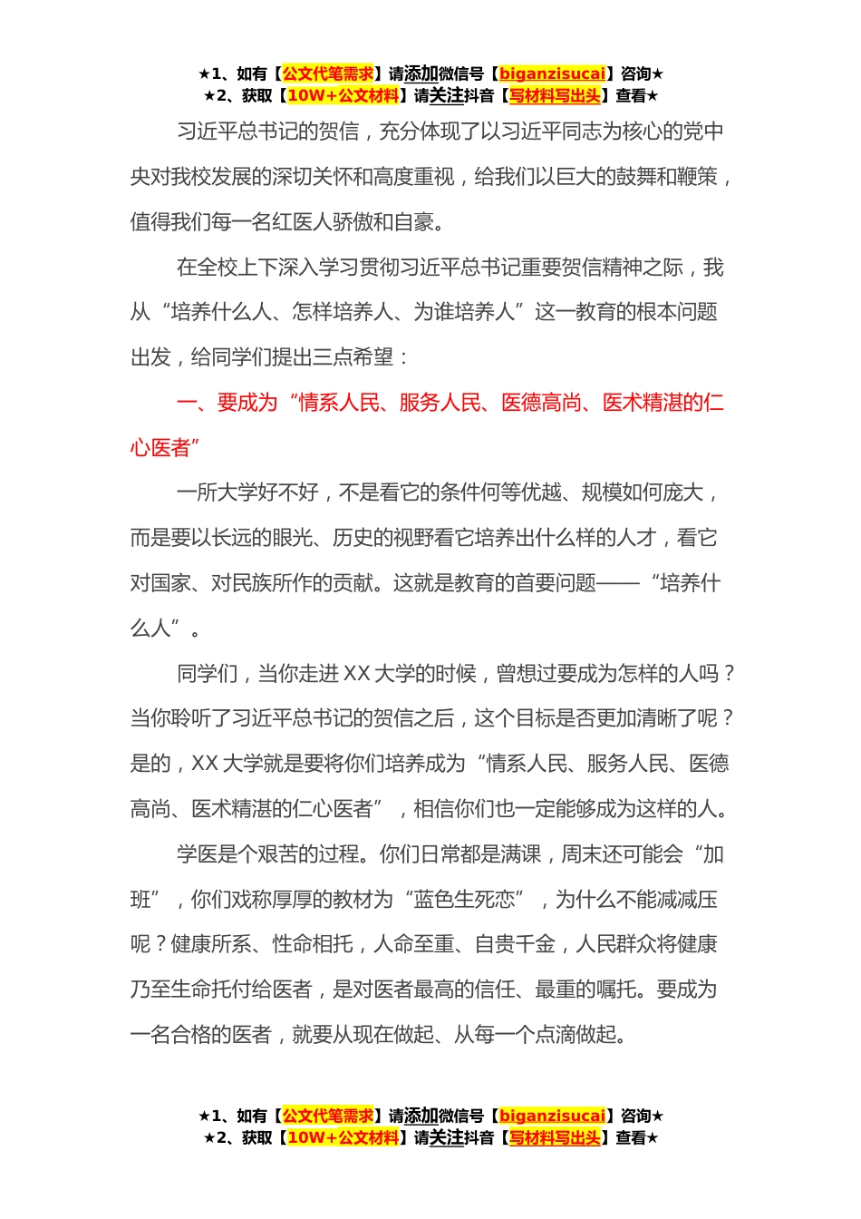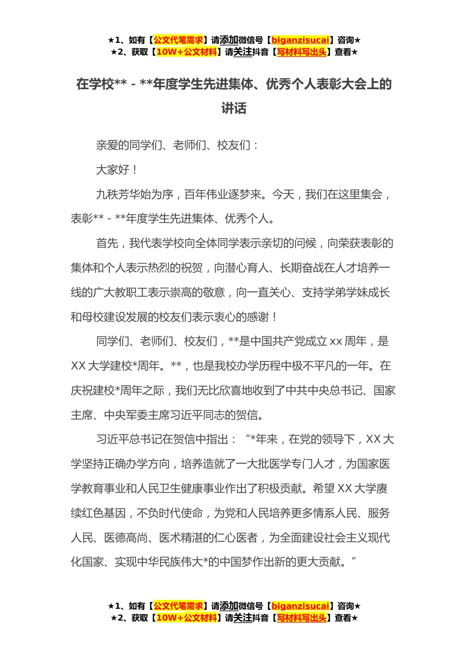 ★1、如有【公文代笔需求】请添加微信号【biganzisucai】咨询★★2、获取【10W+公文材料】请关注抖音【写材料写出头】查看★在学校**-**年度学生先进集体、优秀个人表彰大会上的讲话亲爱的同学们、老师们、校友们:大家好!九秩芳华始为序,百年伟业逐梦来。今天,我们在这里集会,表彰**-**年度学生先进集体、优秀个人。首先,我代表学校向全体同学表示亲切的问候,向荣获表彰的集体和个人表示热烈的祝贺,向潜心育人、长期奋战在人才培养一线的广大教职工表示崇高的敬意,向一直关心、支持学弟学妹成长和母校建设发展的校友们表示衷心的感谢!同学们、老师们、校友们,**是中国共产党成立xx周年,是XX大学建校*周年。**,也是我校办学历程中极不平凡的一年。在庆祝建校*周年之际,我们无比欣喜地收到了中共中...