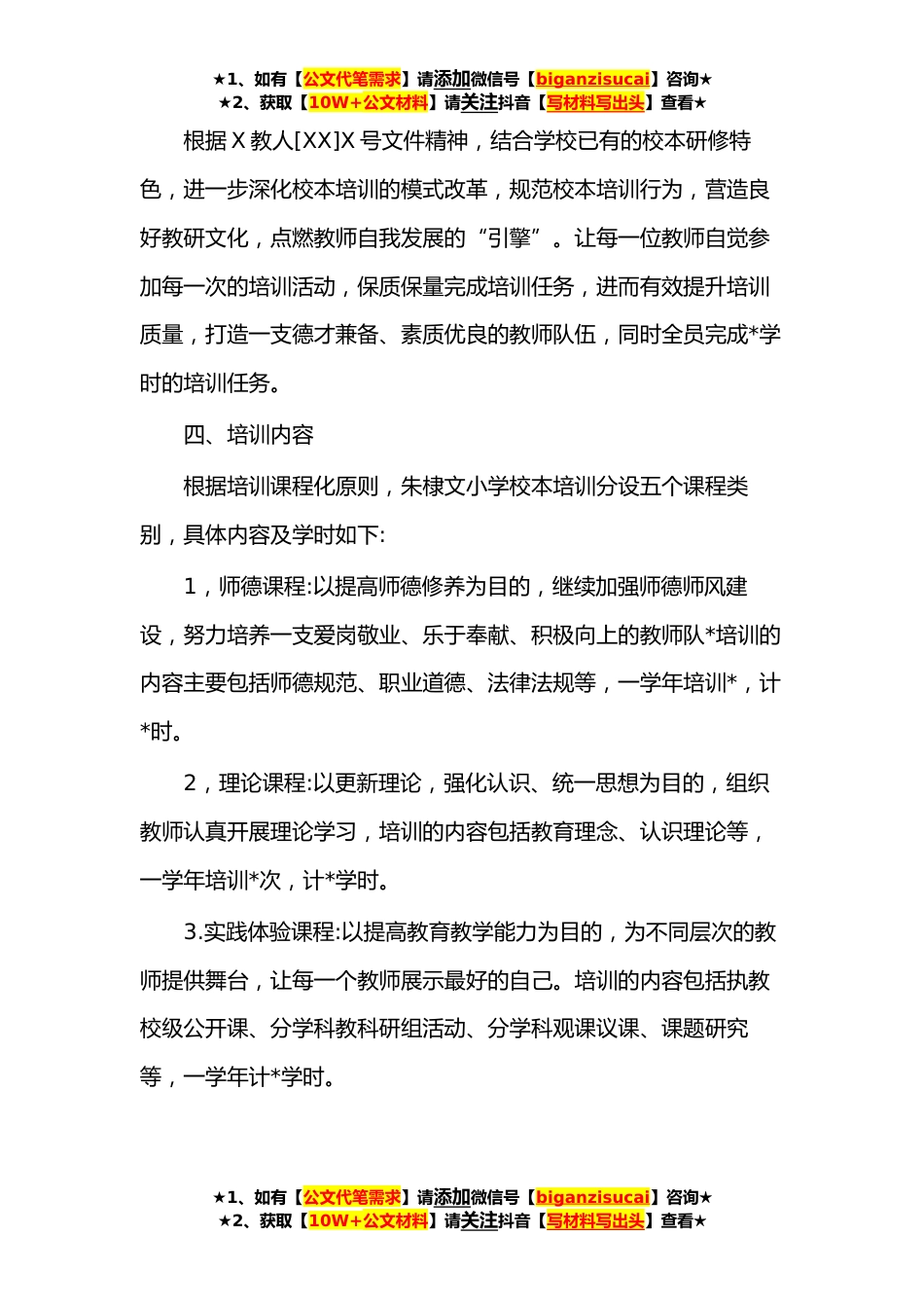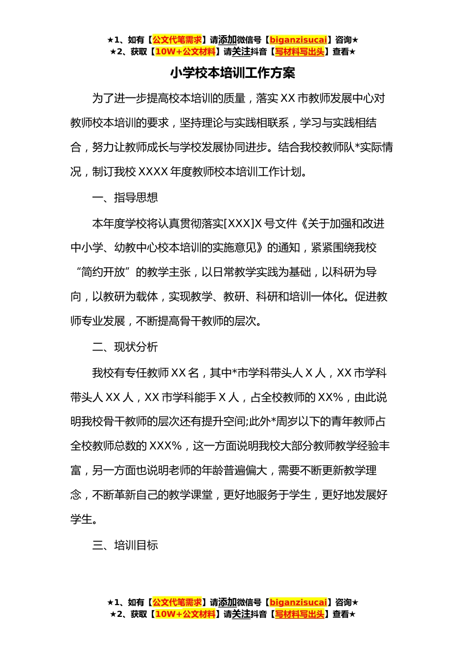 ★1、如有【公文代笔需求】请添加微信号【biganzisucai】咨询★★2、获取【10W+公文材料】请关注抖音【写材料写出头】查看★小学校本培训工作方案为了进一步提高校本培训的质量,落实XX市教师发展中心对教师校本培训的要求,坚持理论与实践相联系,学习与实践相结合,努力让教师成长与学校发展协同进步。结合我校教师队*实际情况,制订我校XXXX年度教师校本培训工作计划。一、指导思想本年度学校将认真贯彻落实[XXX]X号文件《关于加强和改进中小学、幼教中心校本培训的实施意见》的通知,紧紧围绕我校“简约开放”的教学主张,以日常教学实践为基础,以科研为导向,以教研为载体,实现教学、教研、科研和培训一体化。促进教师专业发展,不断提高骨干教师的层次。二、现状分析我校有专任教师XX名,其中*市学科带头...
