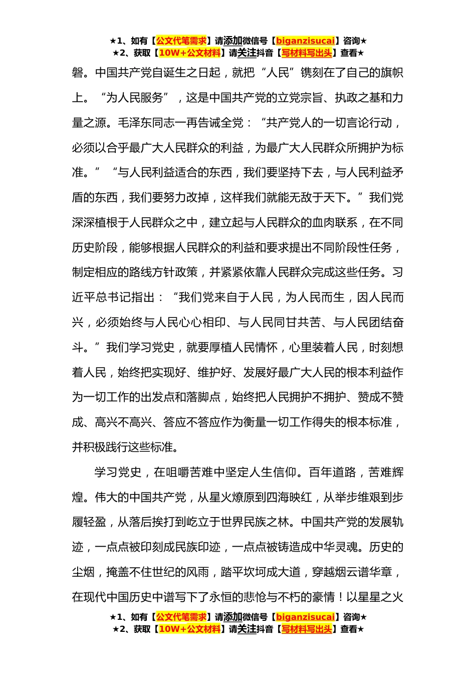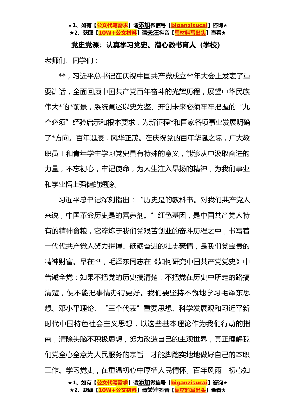★1、如有【公文代笔需求】请添加微信号【biganzisucai】咨询★★2、获取【10W+公文材料】请关注抖音【写材料写出头】查看★党史党课:认真学习党史、潜心教书育人(学校)老师们、同学们:**,习近平总书记在庆祝中国共产党成立**年大会上发表了重要讲话,全面回顾中国共产党百年奋斗的光辉历程,展望中华民族伟大*的*前景,系统阐述以史为鉴、开创未来必须牢牢把握的“九个必须”经验启示和根本要求,为新征程*和国家各项事业发展明确了*方向。百年诞辰,风华正茂。在庆祝党的百年华诞之际,广大教职员工和青年学生学习党史具有特殊的意义,能够从中汲取奋进的力量,不忘初心,牢记使命,为人生注入昂扬的精神,为我们事业和学业插上强健的翅膀。习近平总书记深刻指出:“历史是的教科书。对我们共产党人来说,...