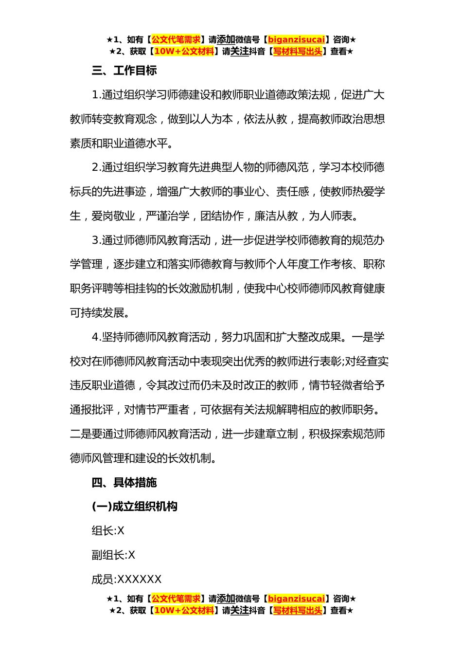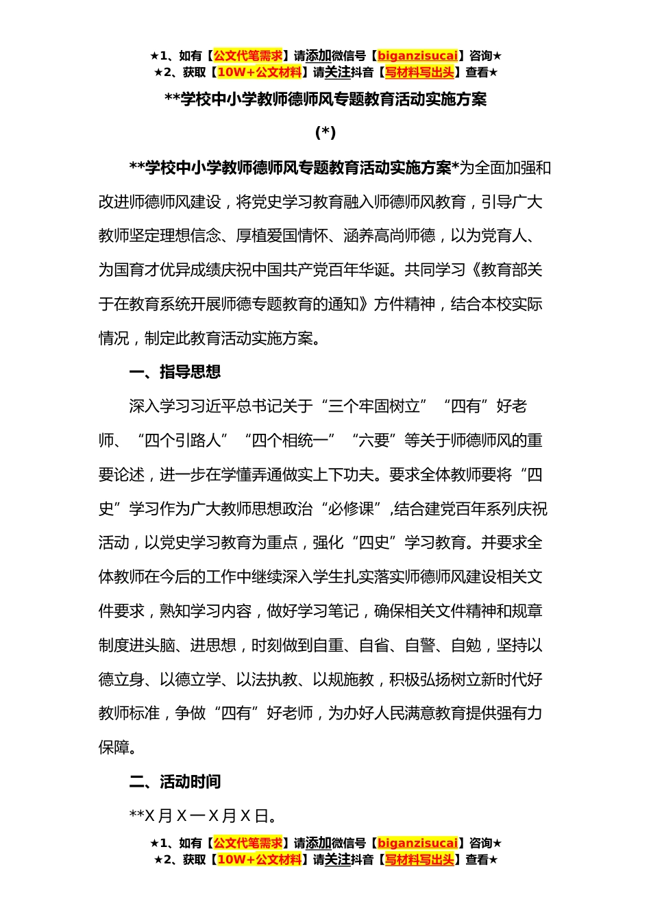 ★1、如有【公文代笔需求】请添加微信号【biganzisucai】咨询★★2、获取【10W+公文材料】请关注抖音【写材料写出头】查看★**学校中小学教师德师风专题教育活动实施方案(*)**学校中小学教师德师风专题教育活动实施方案*为全面加强和改进师德师风建设,将党史学习教育融入师德师风教育,引导广大教师坚定理想信念、厚植爱国情怀、涵养高尚师德,以为党育人、为国育才优异成绩庆祝中国共产党百年华诞。共同学习《教育部关于在教育系统开展师德专题教育的通知》方件精神,结合本校实际情况,制定此教育活动实施方案。一、指导思想深入学习习近平总书记关于“三个牢固树立”“四有”好老师、“四个引路人”“四个相统一”“六要”等关于师德师风的重要论述,进一步在学懂弄通做实上下功夫。要求全体教师要将“四史”...