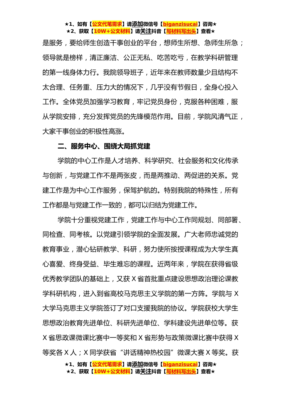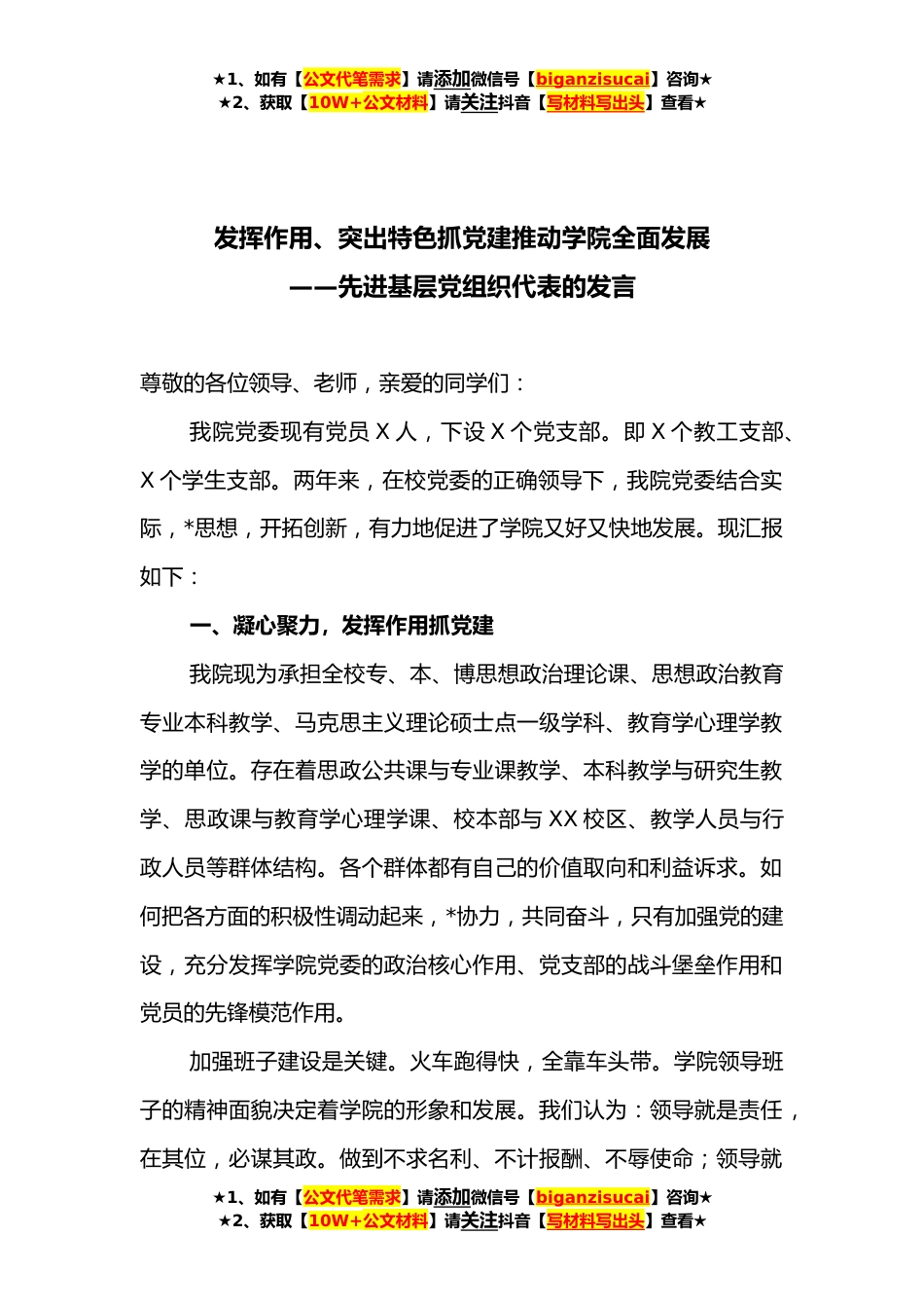 ★1、如有【公文代笔需求】请添加微信号【biganzisucai】咨询★★2、获取【10W+公文材料】请关注抖音【写材料写出头】查看★发挥作用、突出特色抓党建推动学院全面发展——先进基层党组织代表的发言尊敬的各位领导、老师,亲爱的同学们:我院党委现有党员X人,下设X个党支部。即X个教工支部、X个学生支部。两年来,在校党委的正确领导下,我院党委结合实际,*思想,开拓创新,有力地促进了学院又好又快地发展。现汇报如下:一、凝心聚力,发挥作用抓党建我院现为承担全校专、本、博思想政治理论课、思想政治教育专业本科教学、马克思主义理论硕士点一级学科、教育学心理学教学的单位。存在着思政公共课与专业课教学、本科教学与研究生教学、思政课与教育学心理学课、校本部与XX校区、教学人员与行政人员等群体结构...