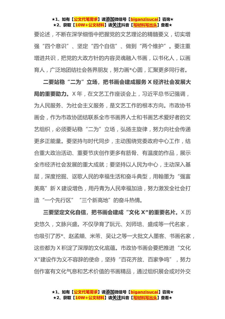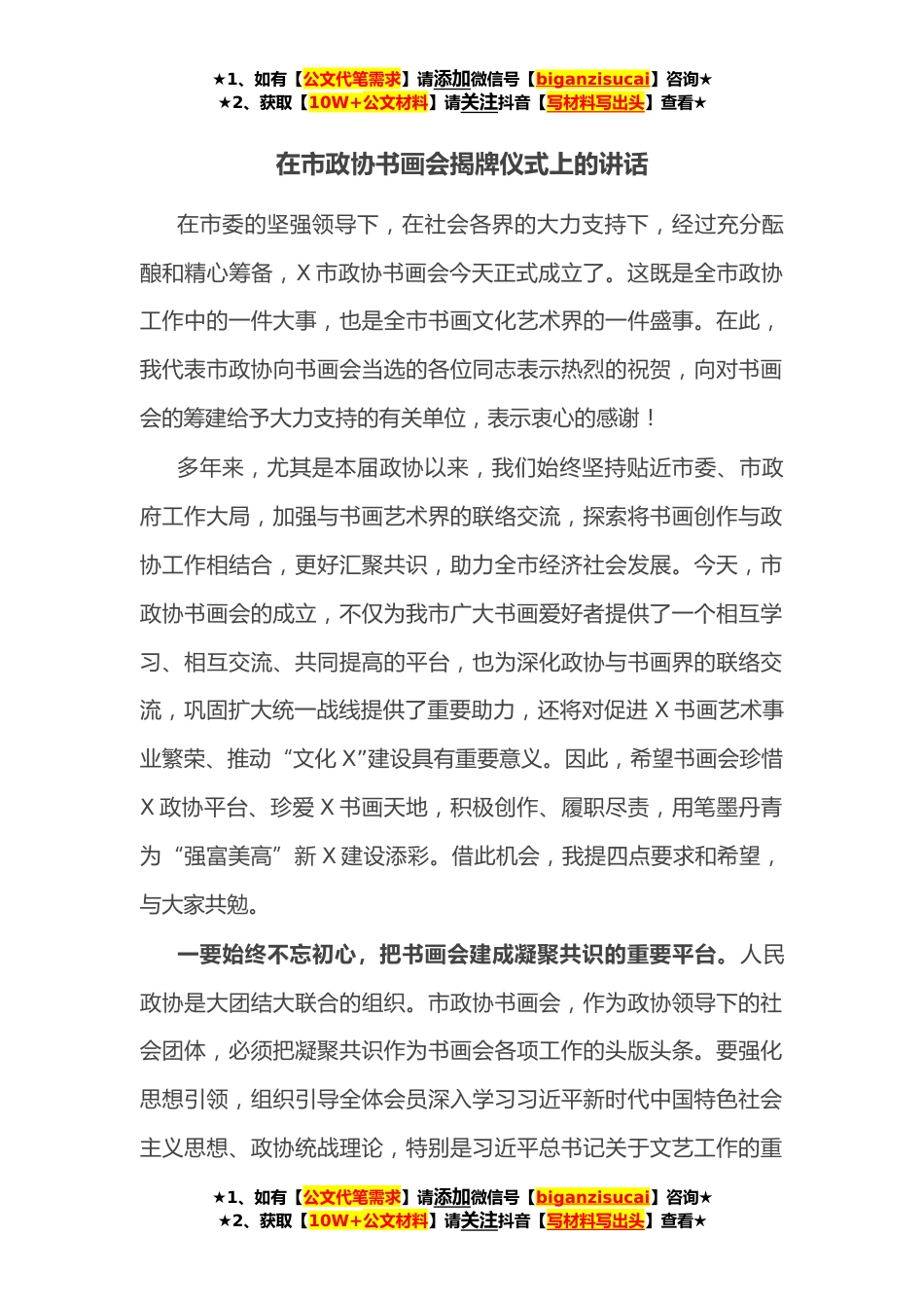 ★1、如有【公文代笔需求】请添加微信号【biganzisucai】咨询★★2、获取【10W+公文材料】请关注抖音【写材料写出头】查看★在市政协书画会揭牌仪式上的讲话在市委的坚强领导下,在社会各界的大力支持下,经过充分酝酿和精心筹备,X市政协书画会今天正式成立了。这既是全市政协工作中的一件大事,也是全市书画文化艺术界的一件盛事。在此,我代表市政协向书画会当选的各位同志表示热烈的祝贺,向对书画会的筹建给予大力支持的有关单位,表示衷心的感谢!多年来,尤其是本届政协以来,我们始终坚持贴近市委、市政府工作大局,加强与书画艺术界的联络交流,探索将书画创作与政协工作相结合,更好汇聚共识,助力全市经济社会发展。今天,市政协书画会的成立,不仅为我市广大书画爱好者提供了一个相互学习、相互交流、...
