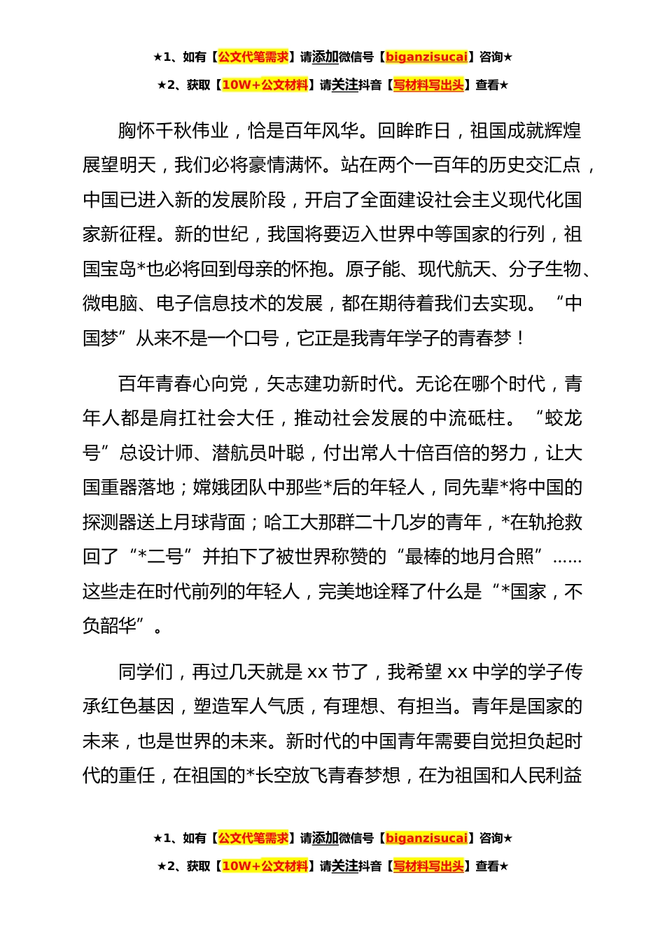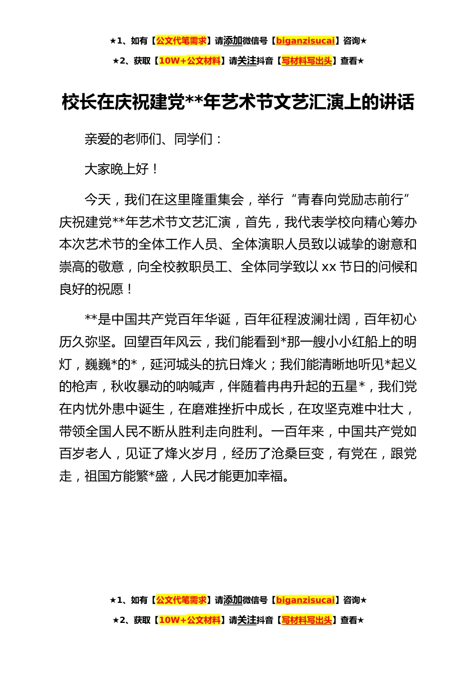 ★1、如有【公文代笔需求】请添加微信号【biganzisucai】咨询★★2、获取【10W+公文材料】请关注抖音【写材料写出头】查看★校长在庆祝建党**年艺术节文艺汇演上的讲话亲爱的老师们、同学们:大家晚上好!今天,我们在这里隆重集会,举行“青春向党励志前行”庆祝建党**年艺术节文艺汇演,首先,我代表学校向精心筹办本次艺术节的全体工作人员、全体演职人员致以诚挚的谢意和崇高的敬意,向全校教职员工、全体同学致以xx节日的问候和良好的祝愿!**是中国共产党百年华诞,百年征程波澜壮阔,百年初心历久弥坚。回望百年风云,我们能看到*那一艘小小红船上的明灯,巍巍*的*,延河城头的抗日烽火;我们能清晰地听见*起义的枪声,秋收暴动的呐喊声,伴随着冉冉升起的五星*,我们党在内忧外患中诞生,在磨难挫折中成长...