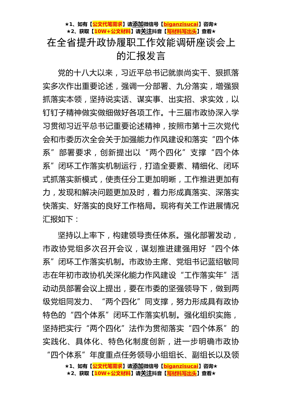 ★1、如有【公文代笔需求】请添加微信号【biganzisucai】咨询★★2、获取【10W+公文材料】请关注抖音【写材料写出头】查看★★1、如有【公文代笔需求】请添加微信号【biganzisucai】咨询★★2、获取【10W+公文材料】请关注抖音【写材料写出头】查看★★1、如有【公文代笔需求】请添加微信号【biganzisucai】咨询★★2、获取【10W+公文材料】请关注抖音【写材料写出头】查看★在全省提升政协履职工作效能调研座谈会上的汇报发言党的十八大以来,习近平总书记就崇尚实干、狠抓落实多次作出重要论述,强调一分部署、九分落实,增强狠抓落实本领,坚持说实话、谋实事、出实招、求实效,以钉钉子精神做实做细做好各项工作。十三届市政协深入学习贯彻习近平总书记重要论述精神,按照市第十三次党代会和市委历次全会关于...