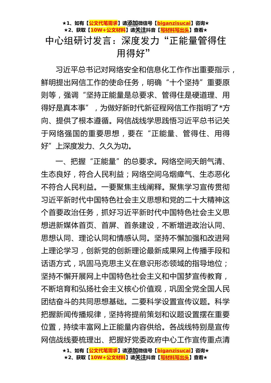 ★1、如有【公文代笔需求】请添加微信号【biganzisucai】咨询★★2、获取【10W+公文材料】请关注抖音【写材料写出头】查看★★1、如有【公文代笔需求】请添加微信号【biganzisucai】咨询★★2、获取【10W+公文材料】请关注抖音【写材料写出头】查看★★1、如有【公文代笔需求】请添加微信号【biganzisucai】咨询★★2、获取【10W+公文材料】请关注抖音【写材料写出头】查看★中心组研讨发言:深度发力“正能量管得住用得好”习近平总书记对网络安全和信息化工作作出重要指示,鲜明提出网信工作的使命任务,明确“十个坚持”重要原则等,强调“坚持正能量是总要求、管得住是硬道理、用得好是真本事”,为做好新时代新征程网信工作指明了*方向、提供了根本遵循。网信战线学思践悟习近平总书记关于网络强国的重要思想...