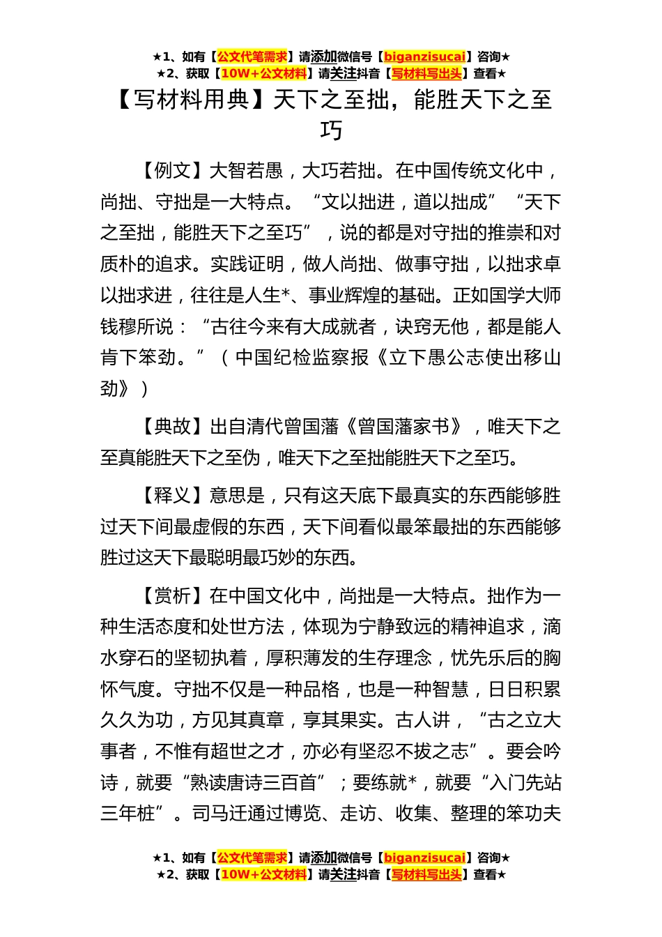 ★1、如有【公文代笔需求】请添加微信号【biganzisucai】咨询★★2、获取【10W+公文材料】请关注抖音【写材料写出头】查看★★1、如有【公文代笔需求】请添加微信号【biganzisucai】咨询★★2、获取【10W+公文材料】请关注抖音【写材料写出头】查看★★1、如有【公文代笔需求】请添加微信号【biganzisucai】咨询★★2、获取【10W+公文材料】请关注抖音【写材料写出头】查看★【写材料用典】天下之至拙,能胜天下之至巧【例文】大智若愚,大巧若拙。在中国传统文化中,尚拙、守拙是一大特点。“文以拙进,道以拙成”“天下之至拙,能胜天下之至巧”,说的都是对守拙的推崇和对质朴的追求。实践证明,做人尚拙、做事守拙,以拙求卓以拙求进,往往是人生*、事业辉煌的基础。正如国学大师钱穆所说:“古往今来有大成就...