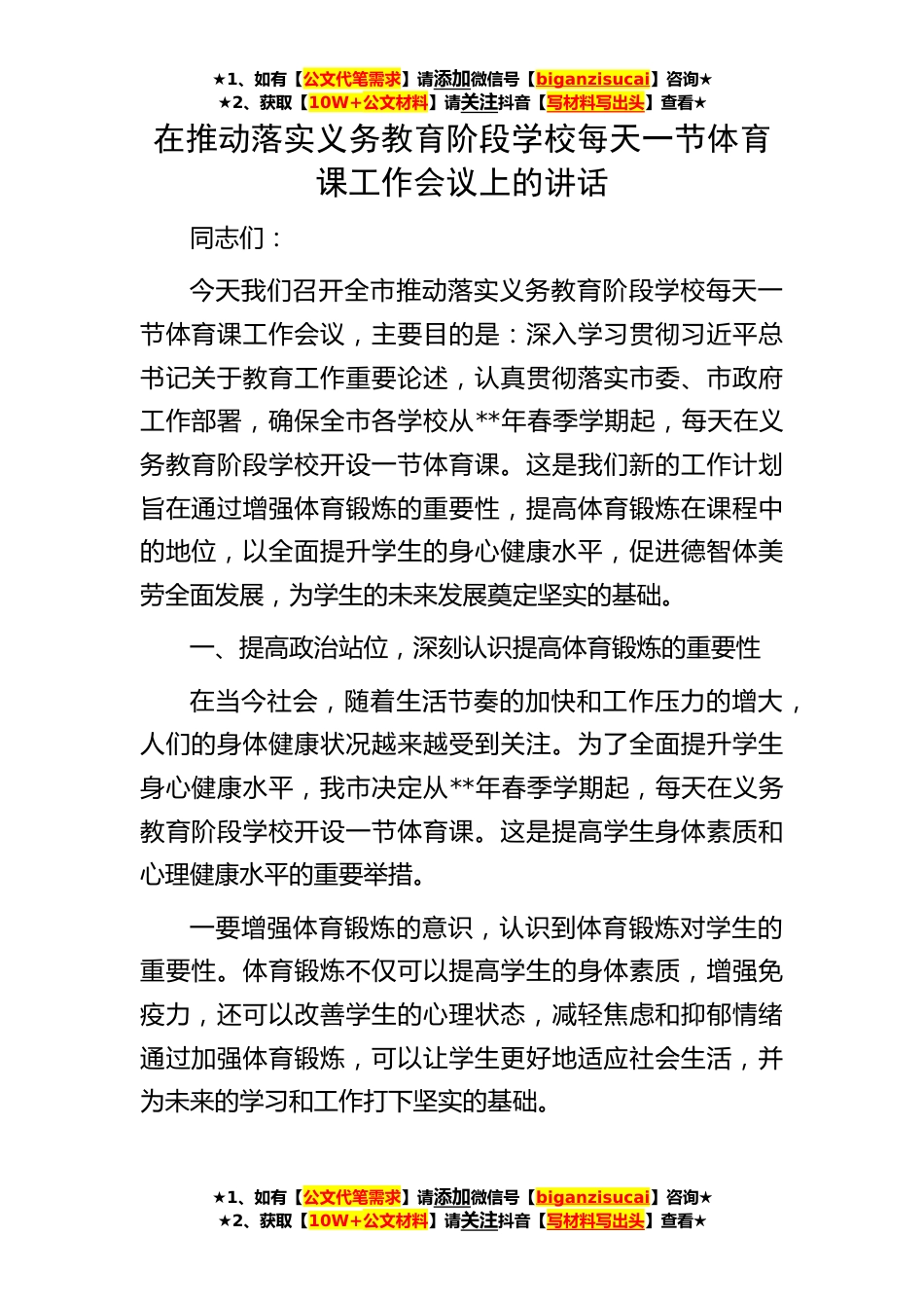 ★1、如有【公文代笔需求】请添加微信号【biganzisucai】咨询★★2、获取【10W+公文材料】请关注抖音【写材料写出头】查看★★1、如有【公文代笔需求】请添加微信号【biganzisucai】咨询★★2、获取【10W+公文材料】请关注抖音【写材料写出头】查看★★1、如有【公文代笔需求】请添加微信号【biganzisucai】咨询★★2、获取【10W+公文材料】请关注抖音【写材料写出头】查看★在推动落实义务教育阶段学校每天一节体育课工作会议上的讲话同志们:今天我们召开全市推动落实义务教育阶段学校每天一节体育课工作会议,主要目的是:深入学习贯彻习近平总书记关于教育工作重要论述,认真贯彻落实市委、市政府工作部署,确保全市各学校从**年春季学期起,每天在义务教育阶段学校开设一节体育课。这是我们新的工作计划旨在...
