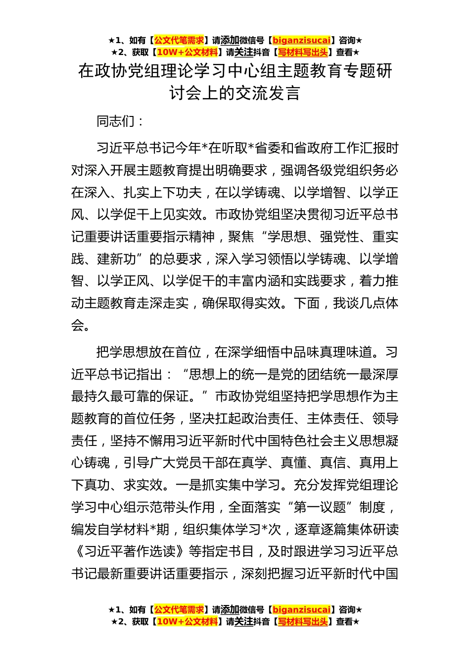 ★1、如有【公文代笔需求】请添加微信号【biganzisucai】咨询★★2、获取【10W+公文材料】请关注抖音【写材料写出头】查看★★1、如有【公文代笔需求】请添加微信号【biganzisucai】咨询★★2、获取【10W+公文材料】请关注抖音【写材料写出头】查看★★1、如有【公文代笔需求】请添加微信号【biganzisucai】咨询★★2、获取【10W+公文材料】请关注抖音【写材料写出头】查看★在政协党组理论学习中心组主题教育专题研讨会上的交流发言同志们:习近平总书记今年*在听取*省委和省政府工作汇报时对深入开展主题教育提出明确要求,强调各级党组织务必在深入、扎实上下功夫,在以学铸魂、以学增智、以学正风、以学促干上见实效。市政协党组坚决贯彻习近平总书记重要讲话重要指示精神,聚焦“学思想、强党性、重实践、建...