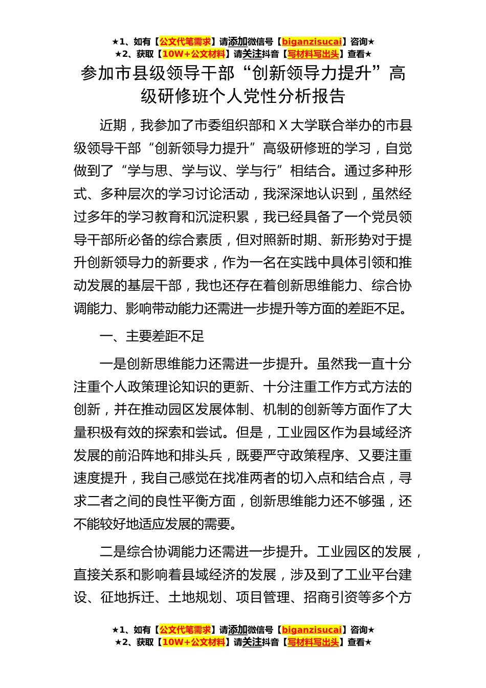 ★1、如有【公文代笔需求】请添加微信号【biganzisucai】咨询★★2、获取【10W+公文材料】请关注抖音【写材料写出头】查看★★1、如有【公文代笔需求】请添加微信号【biganzisucai】咨询★★2、获取【10W+公文材料】请关注抖音【写材料写出头】查看★★1、如有【公文代笔需求】请添加微信号【biganzisucai】咨询★★2、获取【10W+公文材料】请关注抖音【写材料写出头】查看★参加市县级领导干部“创新领导力提升”高级研修班个人党性分析报告近期,我参加了市委组织部和X大学联合举办的市县级领导干部“创新领导力提升”高级研修班的学习,自觉做到了“学与思、学与议、学与行”相结合。通过多种形式、多种层次的学习讨论活动,我深深地认识到,虽然经过多年的学习教育和沉淀积累,我已经具备了一个党员领导干部所...