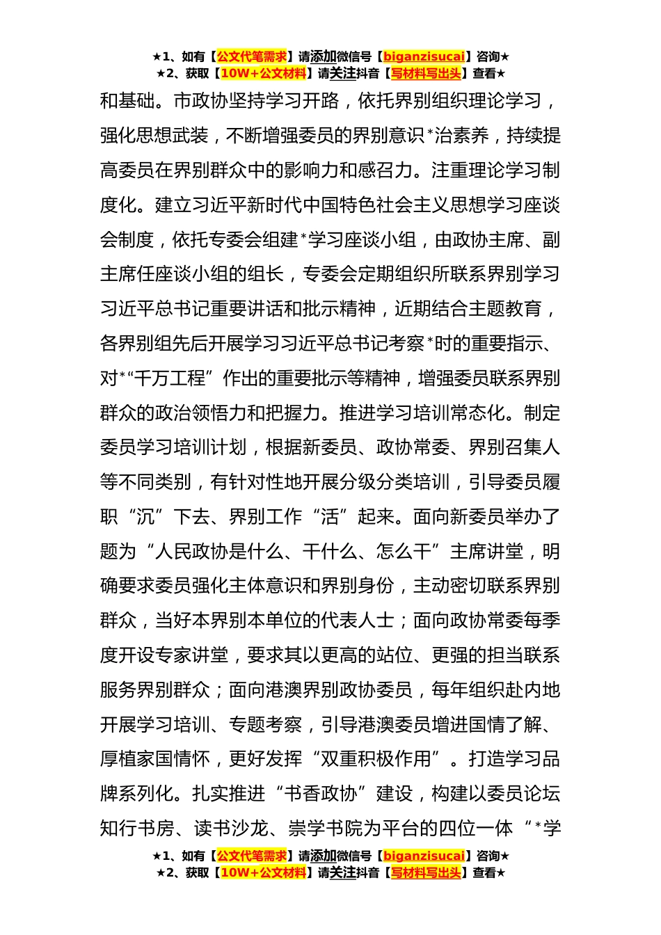 ★1、如有【公文代笔需求】请添加微信号【biganzisucai】咨询★★2、获取【10W+公文材料】请关注抖音【写材料写出头】查看★在发挥政协界别作用专题座谈会上的交流发言尊敬的各位领导,各位委员,同志们:习近平总书记指出,广大政协委员要切实发挥在本职工作中的带头作用、界别群众中的代表作用,不负重托,不辱使命。委员是政协工作的主体,界别是政协组织的基础,界别工作活,则委员“声音响”、政协作用显。市政协注重发挥政协委员在界别群众中的代表作用,着力从思想引领、履职渠道、制度建设等方面切实让界别意识“强起来”、声音“响起来”、工作“活起来”,以实际行动全面体现“一根头发”团结带动“一把头发”的深层内涵书写好政协委员为界别群众代言的有效实践。现将我市工作进展情况汇报如下:加强思...