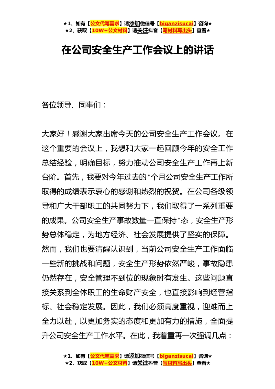 ★1、如有【公文代笔需求】请添加微信号【biganzisucai】咨询★★2、获取【10W+公文材料】请关注抖音【写材料写出头】查看★在公司安全生产工作会议上的讲话各位领导、同事们:大家好!感谢大家出席今天的公司安全生产工作会议。在这个重要的会议上,我想和大家一起回顾今年的安全工作总结经验,明确目标,努力推动公司安全生产工作再上新台阶。首先,我要对今年过去的*个月公司安全生产工作所取得的成绩表示衷心的感谢和热烈的祝贺。在公司各级领导和广大干部职工的共同努力下,我们取得了一系列重要的成果。公司安全生产事故数量一直保持*态,安全生产形势总体稳定,为地方经济、社会发展提供了坚实的保障。然而,我们也要清醒认识到,当前公司安全生产工作面临一些新的挑战和问题,安全生产形势依然严峻,事故...