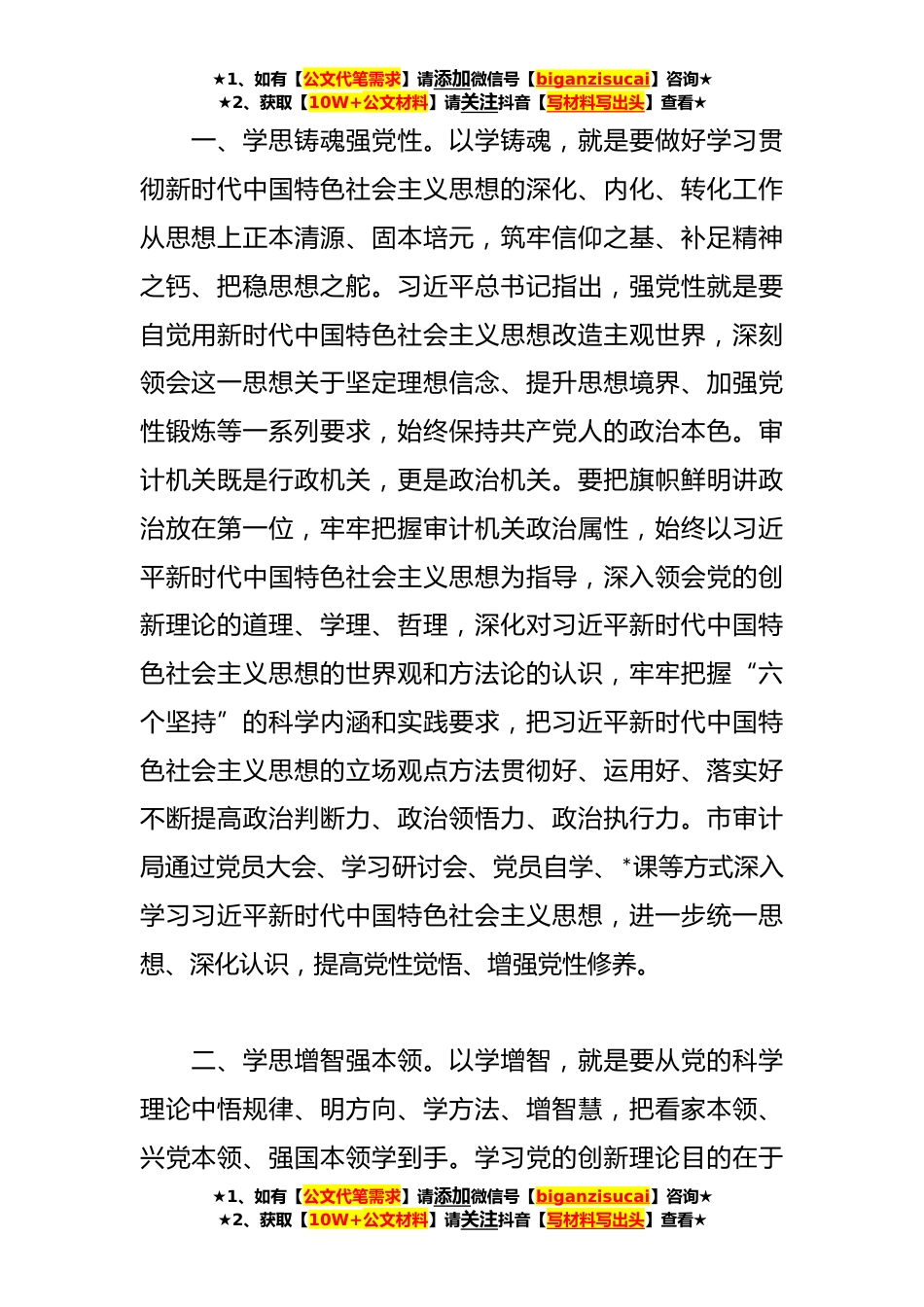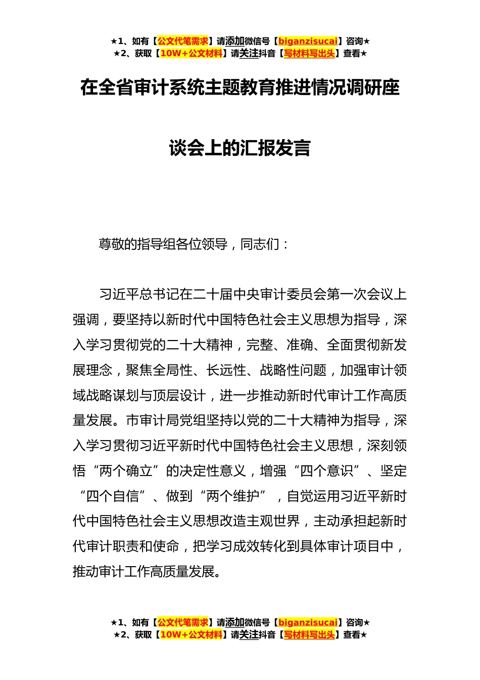 ★1、如有【公文代笔需求】请添加微信号【biganzisucai】咨询★★2、获取【10W+公文材料】请关注抖音【写材料写出头】查看★在全省审计系统主题教育推进情况调研座谈会上的汇报发言尊敬的指导组各位领导,同志们:习近平总书记在二十届中央审计委员会第一次会议上强调,要坚持以新时代中国特色社会主义思想为指导,深入学习贯彻党的二十大精神,完整、准确、全面贯彻新发展理念,聚焦全局性、长远性、战略性问题,加强审计领域战略谋划与顶层设计,进一步推动新时代审计工作高质量发展。市审计局党组坚持以党的二十大精神为指导,深入学习贯彻习近平新时代中国特色社会主义思想,深刻领悟“两个确立”的决定性意义,增强“四个意识”、坚定“四个自信”、做到“两个维护”,自觉运用习近平新时代中国特色社会主义...