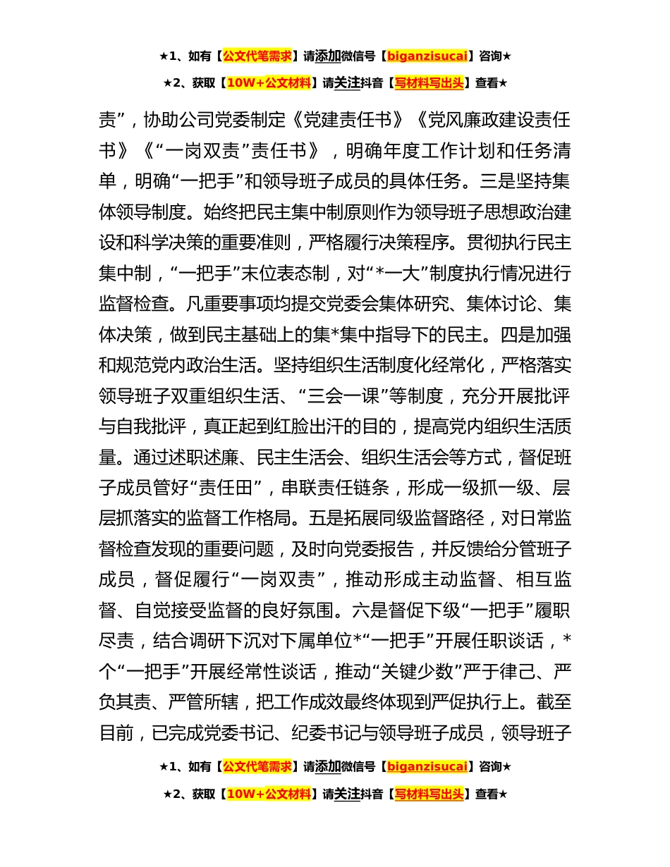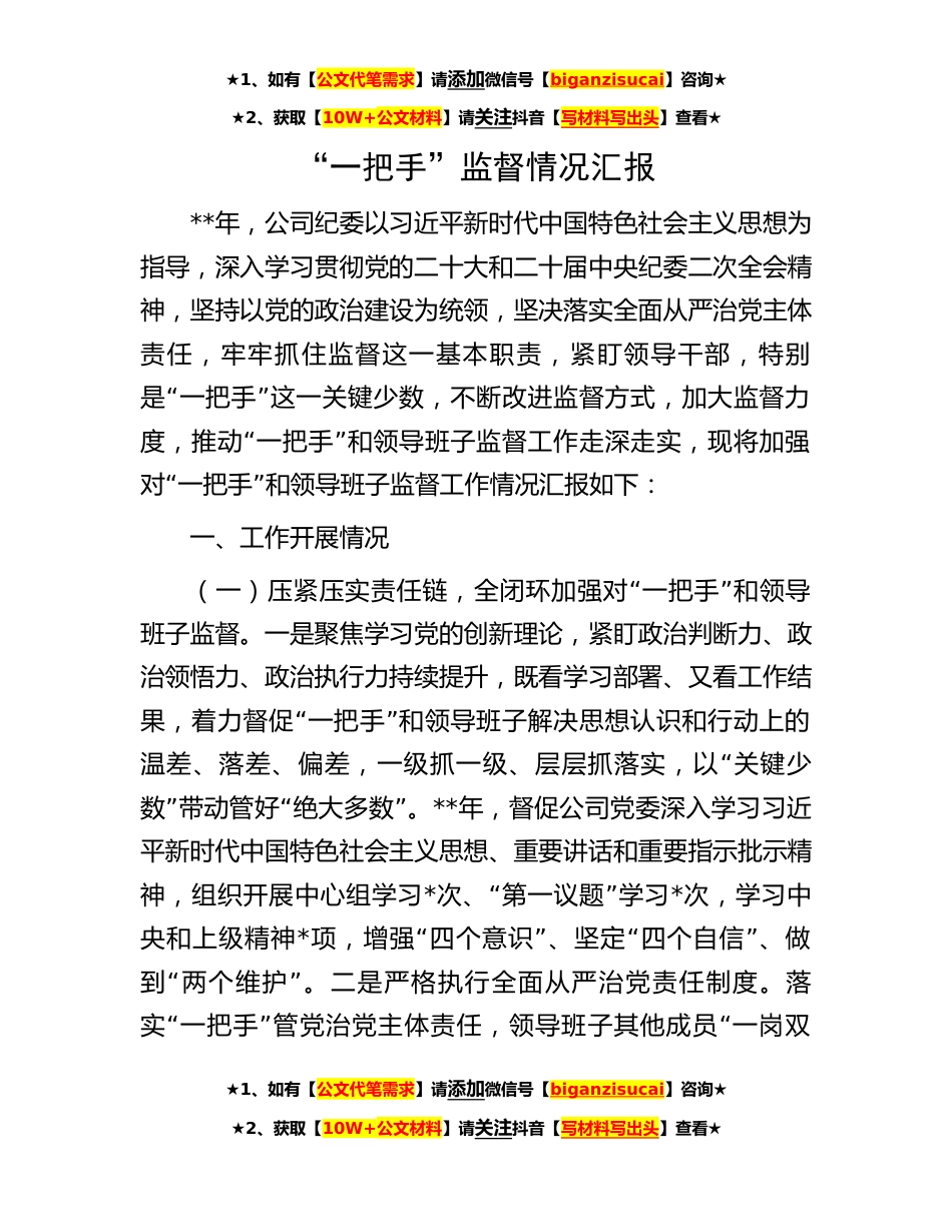 ★1、如有【公文代笔需求】请添加微信号【biganzisucai】咨询★★2、获取【10W+公文材料】请关注抖音【写材料写出头】查看★“一把手”监督情况汇报**年,公司纪委以习近平新时代中国特色社会主义思想为指导,深入学习贯彻党的二十大和二十届中央纪委二次全会精神,坚持以党的政治建设为统领,坚决落实全面从严治党主体责任,牢牢抓住监督这一基本职责,紧盯领导干部,特别“”是一把手这一关键少数,不断改进监督方式,加大监督力“”度,推动一把手和领导班子监督工作走深走实,现将加强“”对一把手和领导班子监督工作情况汇报如下:一、工作开展情况“”(一)压紧压实责任链,全闭环加强对一把手和领导班子监督。一是聚焦学习党的创新理论,紧盯政治判断力、政治领悟力、政治执行力持续提升,既看学习部署、...
