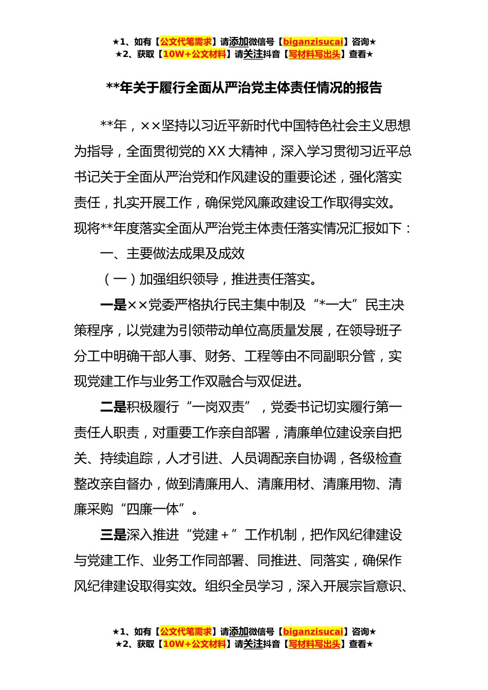 ★1、如有【公文代笔需求】请添加微信号【biganzisucai】咨询★★2、获取【10W+公文材料】请关注抖音【写材料写出头】查看★**年关于履行全面从严治党主体责任情况的报告**年,××坚持以习近平新时代中国特色社会主义思想为指导,全面贯彻党的XX大精神,深入学习贯彻习近平总书记关于全面从严治党和作风建设的重要论述,强化落实责任,扎实开展工作,确保党风廉政建设工作取得实效。现将**年度落实全面从严治党主体责任落实情况汇报如下:一、主要做法成果及成效(一)加强组织领导,推进责任落实。一是××党委严格执行民主集中制及“*一大”民主决策程序,以党建为引领带动单位高质量发展,在领导班子分工中明确干部人事、财务、工程等由不同副职分管,实现党建工作与业务工作双融合与双促进。二是积极履行“一...