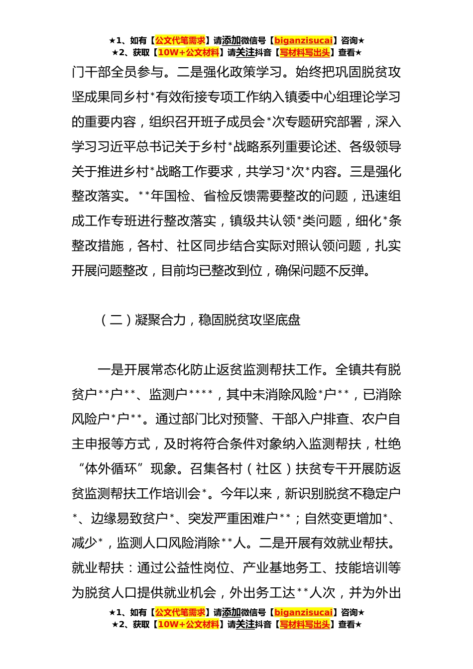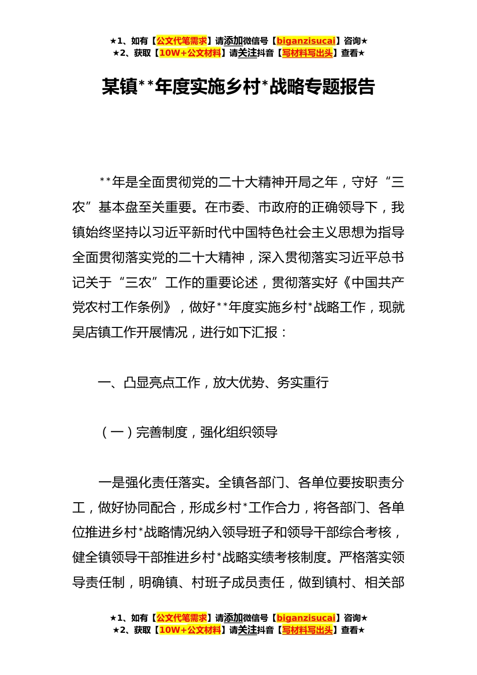 ★1、如有【公文代笔需求】请添加微信号【biganzisucai】咨询★★2、获取【10W+公文材料】请关注抖音【写材料写出头】查看★某镇**年度实施乡村*战略专题报告**年是全面贯彻党的二十大精神开局之年,守好“三农”基本盘至关重要。在市委、市政府的正确领导下,我镇始终坚持以习近平新时代中国特色社会主义思想为指导全面贯彻落实党的二十大精神,深入贯彻落实习近平总书记关于“三农”工作的重要论述,贯彻落实好《中国共产党农村工作条例》,做好**年度实施乡村*战略工作,现就吴店镇工作开展情况,进行如下汇报:一、凸显亮点工作,放大优势、务实重行(一)完善制度,强化组织领导一是强化责任落实。全镇各部门、各单位要按职责分工,做好协同配合,形成乡村*工作合力,将各部门、各单位推进乡村*战略情况纳入...