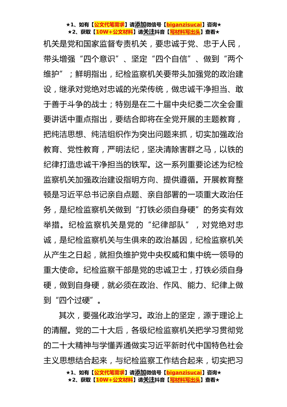 ★1、如有【公文代笔需求】请添加微信号【biganzisucai】咨询★★2、获取【10W+公文材料】请关注抖音【写材料写出头】查看★某市纪委书记、监委主任廉政党课:牢记职责使命,永远担当作为,争做忠诚干净担当的纪检监察铁军(**)同志们:自今年年初以来,在中央纪委、国家监委统一部署下,在全国纪检监察队*展了教育整顿工作,其中有一项重要任务,及时领导带头讲党课。为认真落实这一精神,扎实推进各项工作,以丰富多彩的活动推动教育整顿提质增效,我们在全市范围内进行统筹,每月安排*纪委书记讲党课,取得较好效果。按照计划安排,今天由我*课,综合今年来教育整顿开展情况,结合当前纪检监察干部队*状,决定围绕“牢记职责使命,永远担当作为,争做忠诚干净担当的纪检监察铁军”和大家讲一堂廉政党课,也算...