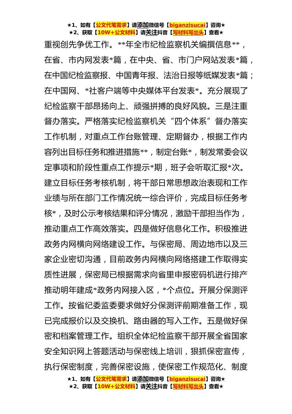 ★1、如有【公文代笔需求】请添加微信号【biganzisucai】咨询★★2、获取【10W+公文材料】请关注抖音【写材料写出头】查看★纪委领导**年度述职述廉述法报告根据**年度领导班子和领导干部考核工作要求,现将本人**年以来工作及履职情况报告如下。(一)加强思想政治学习,不断提高自身素养。本人坚持以习近平新时代中国特色社会主义思想为指导,进一步坚定“四个自信”,拥护“两个确立”,做到“两个维护”。及时跟进学习习近平总书记重要讲话重要指示批示精神和党的二十大精神,严格按照纪检监察干部队*育整顿要求学习规定篇目,始终做到讲政治、重学习,做到工学结合,学以致用,把学习成果融汇于工作实践,不断提高解决实际问题的能力。在平时工作中,做到讲民主、守原则,自觉维护分管战线的团结,对班子决定...