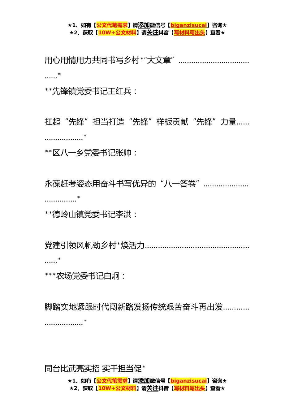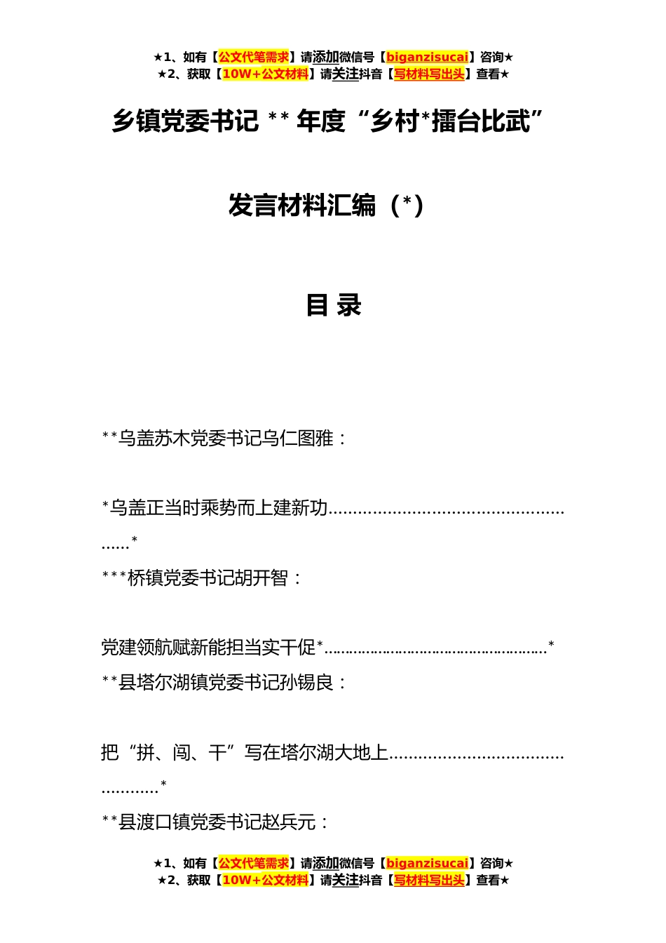 ★1、如有【公文代笔需求】请添加微信号【biganzisucai】咨询★★2、获取【10W+公文材料】请关注抖音【写材料写出头】查看★乡镇党委书记**年度“乡村*擂台比武”发言材料汇编(*)目录**乌盖苏木党委书记乌仁图雅:*乌盖正当时乘势而上建新功………………………………………………****桥镇党委书记胡开智:党建领航赋新能担当实干促*………………………………………………***县塔尔湖镇党委书记孙锡良:把“拼、闯、干”写在塔尔湖大地上…………………………………………***县渡口镇党委书记赵兵元:★1、如有【公文代笔需求】请添加微信号【biganzisucai】咨询★★2、获取【10W+公文材料】请关注抖音【写材料写出头】查看★★1、如有【公文代笔需求】请添加微信号【biganzisucai】咨询★★2、获取【10W+公文材...