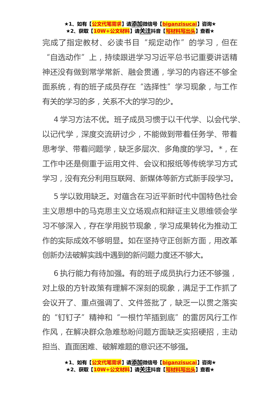 ★1、如有【公文代笔需求】请添加微信号【biganzisucai】咨询★★2、获取【10W+公文材料】请关注抖音【写材料写出头】查看★**年度主题教育班子成员对照检查、检视剖析问题清单(精选*条)1政治思想意识不够强。虽然领导班子能够做到旗帜鲜明讲政治,始终把政治建设摆在突出位置,但个别班子成员站在政治高度上看问题的意识还不够强烈,特别是在日常生活中,一言一行不够严谨,没有完全做到遇事多想政治要求、办事多想政治规矩、处事多想政治影响、成事多想政治效果,在谋划工作和处理问题上,“国之大者”的政治意识不足。2深入贯彻“两个维护”的践行力度还需加强。班子成员能够在政治上始终保持清醒头脑,在大是大非面前始终做到立场坚定,对中央和省市县委决策部署不折不扣贯彻落实。但有时还存在敏锐性、执行...