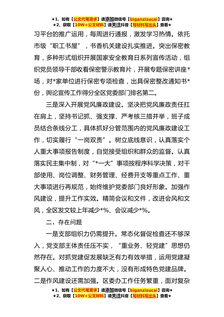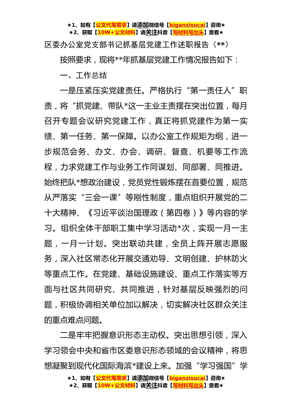 ★1、如有【公文代笔需求】请添加微信号【biganzisucai】咨询★★2、获取【10W+公文材料】请关注抖音【写材料写出头】查看★区委办公室党支部书记抓基层党建工作述职报告(**)按照要求,现将**年抓基层党建工作情况报告如下:一、工作总结一是压紧压实党建责任。严格执行“第一责任人”职责,将“抓党建、带队*这一主业主责摆在突出位置,每月召开专题会议研究党建工作,真正将抓党建作为第一实绩、第一任务、第一保障。以办公室工作规矩为纲,进一步规范会务、办文、办会、调研、督查、机要等工作流程,力求党建工作与业务工作同谋划、同部署、同推进。始终把队*想政治建设,党员党性锻炼摆在首要位置,规范从严落实“三会一课”等刚性制度,重点组织开展党的二十大精神、《习近平谈治国理政(第四卷)》等内容...