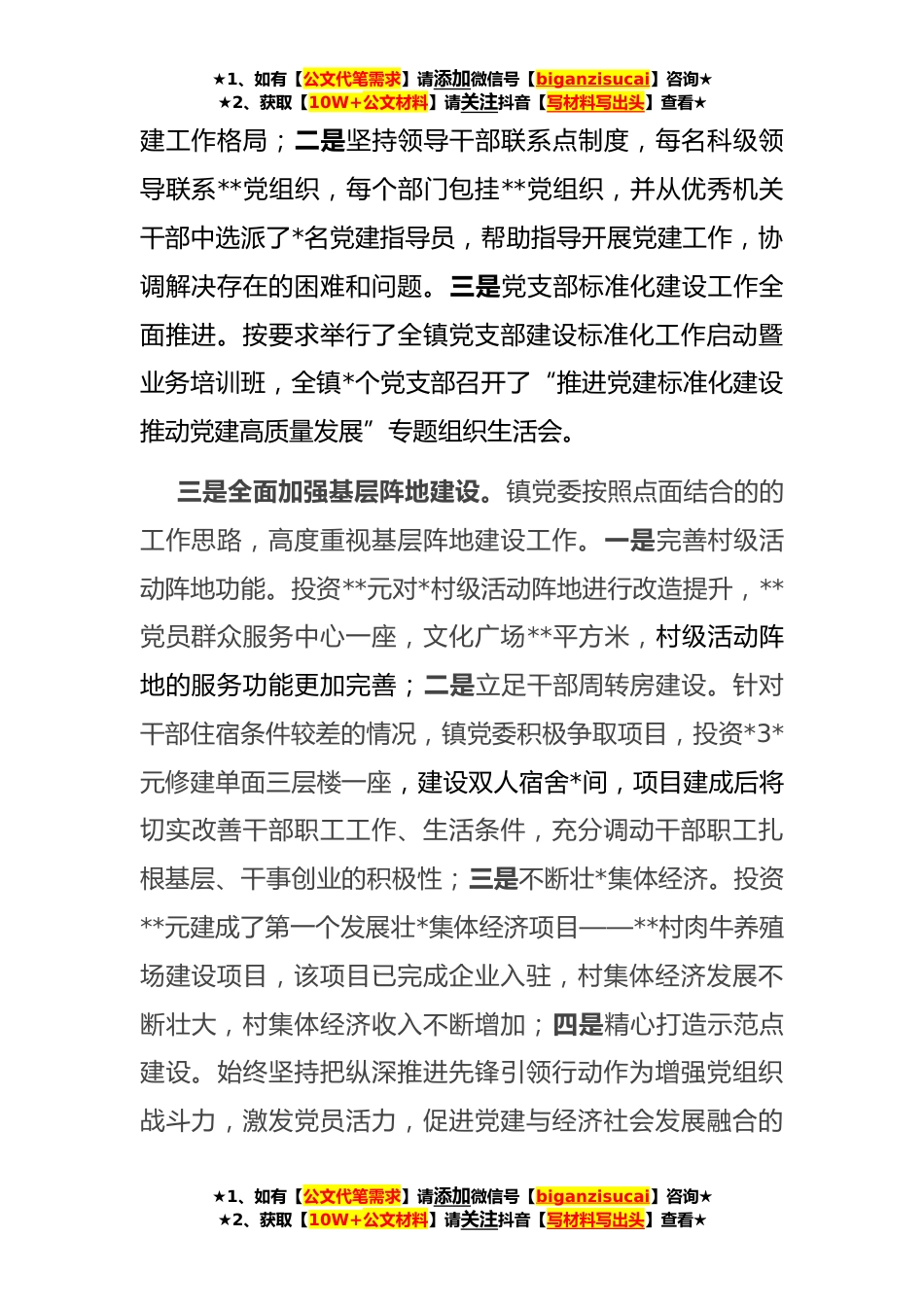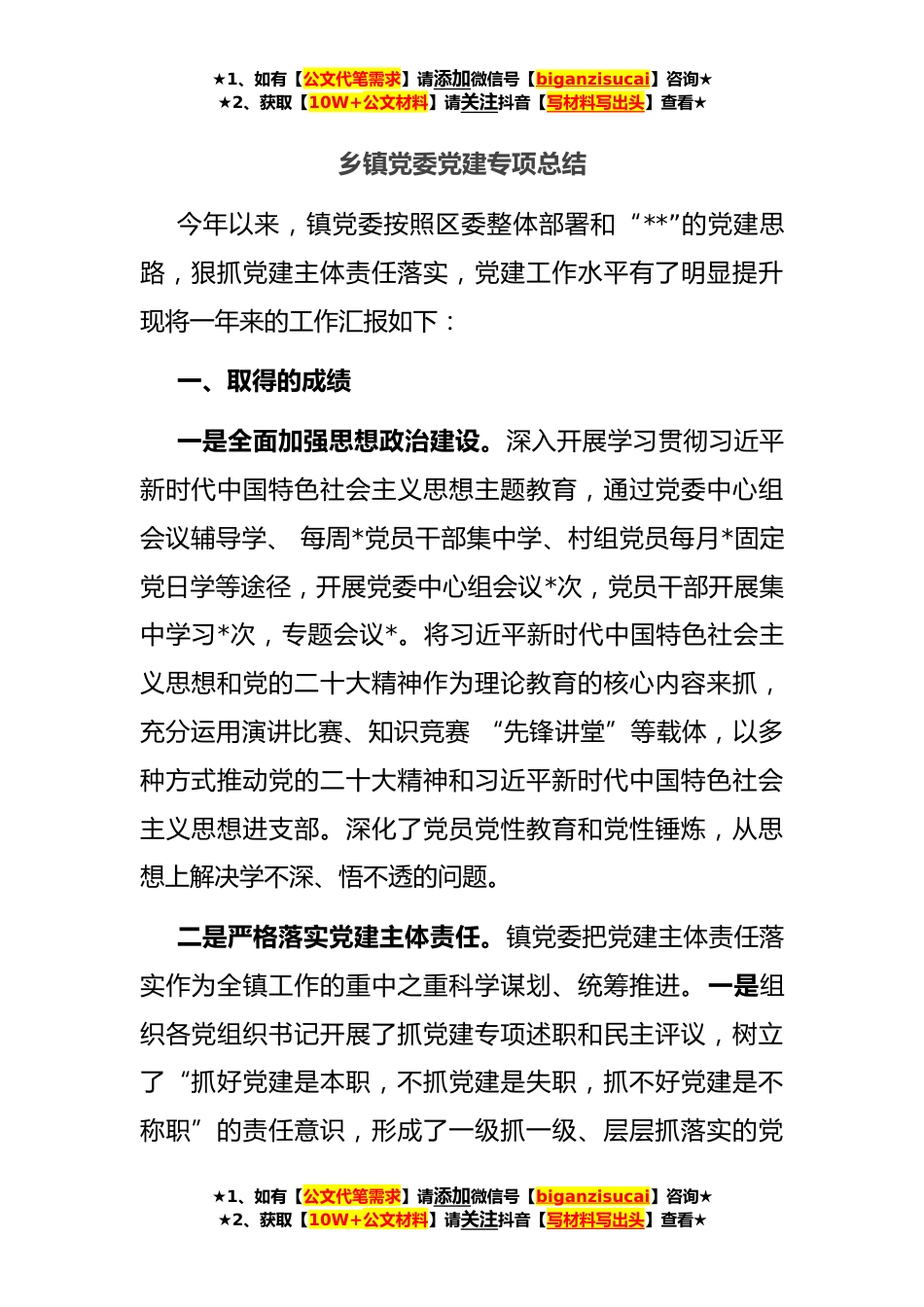 ★1、如有【公文代笔需求】请添加微信号【biganzisucai】咨询★★2、获取【10W+公文材料】请关注抖音【写材料写出头】查看★乡镇党委党建专项总结今年以来,镇党委按照区委整体部署和“**”的党建思路,狠抓党建主体责任落实,党建工作水平有了明显提升现将一年来的工作汇报如下:一、取得的成绩一是全面加强思想政治建设。深入开展学习贯彻习近平新时代中国特色社会主义思想主题教育,通过党委中心组会议辅导学、每周*党员干部集中学、村组党员每月*固定党日学等途径,开展党委中心组会议*次,党员干部开展集中学习*次,专题会议*。将习近平新时代中国特色社会主义思想和党的二十大精神作为理论教育的核心内容来抓,充分运用演讲比赛、知识竞赛“先锋讲堂”等载体,以多种方式推动党的二十大精神和习近平新时代中...
