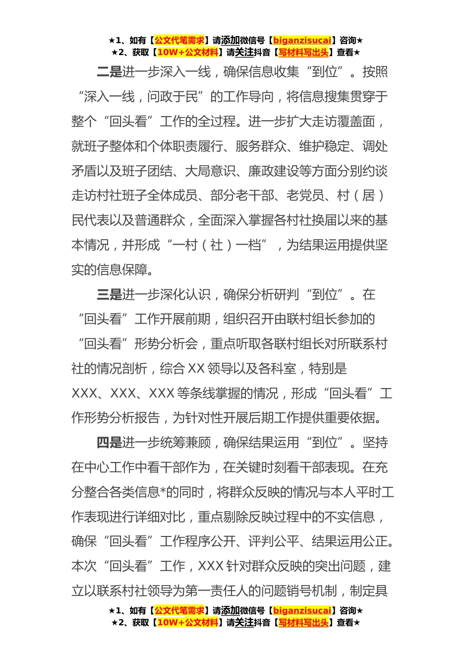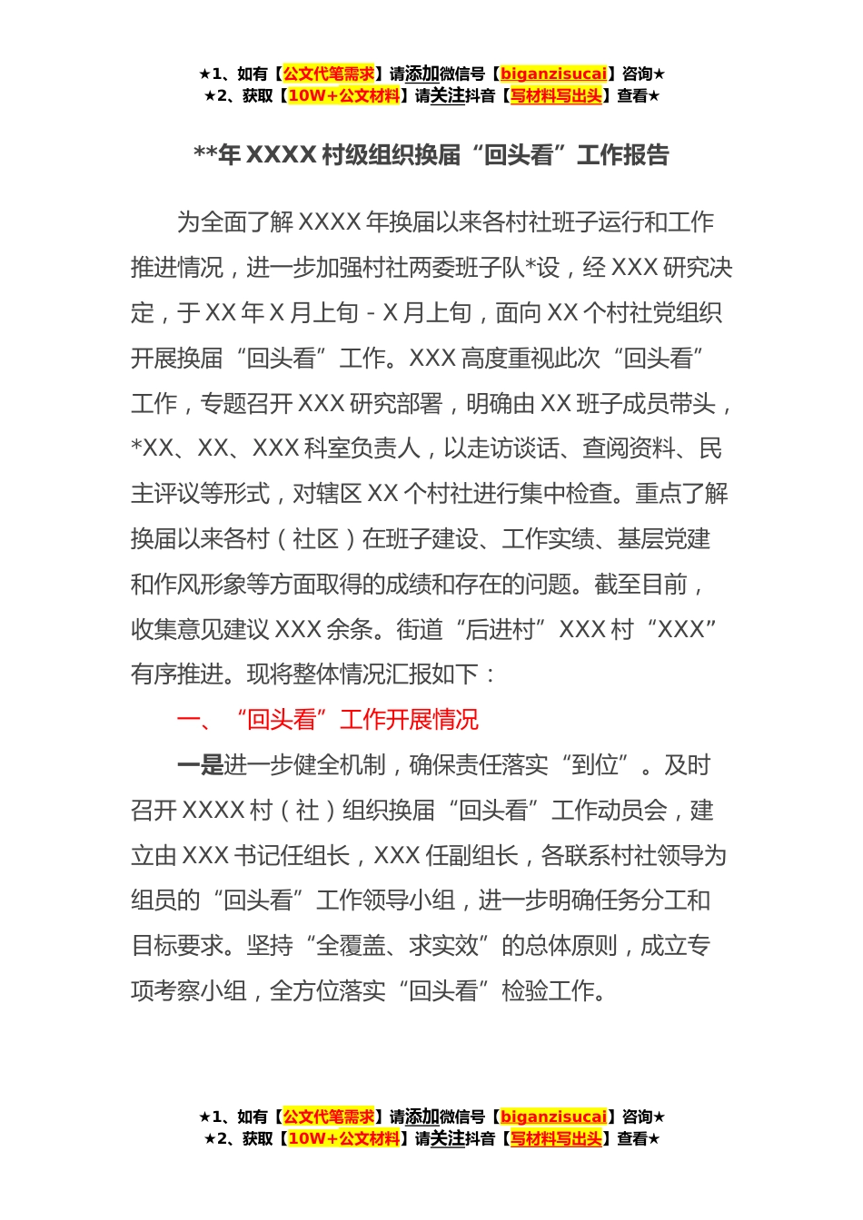 ★1、如有【公文代笔需求】请添加微信号【biganzisucai】咨询★★2、获取【10W+公文材料】请关注抖音【写材料写出头】查看★**年XXXX村级组织换届“回头看”工作报告为全面了解XXXX年换届以来各村社班子运行和工作推进情况,进一步加强村社两委班子队*设,经XXX研究决定,于XX年X月上旬-X月上旬,面向XX个村社党组织开展换届“回头看”工作。XXX高度重视此次“回头看”工作,专题召开XXX研究部署,明确由XX班子成员带头,*XX、XX、XXX科室负责人,以走访谈话、查阅资料、民主评议等形式,对辖区XX个村社进行集中检查。重点了解换届以来各村(社区)在班子建设、工作实绩、基层党建和作风形象等方面取得的成绩和存在的问题。截至目前,收集意见建议XXX余条。街道“后进村”XXX村“XXX”有序推进。现将整体情况汇报...