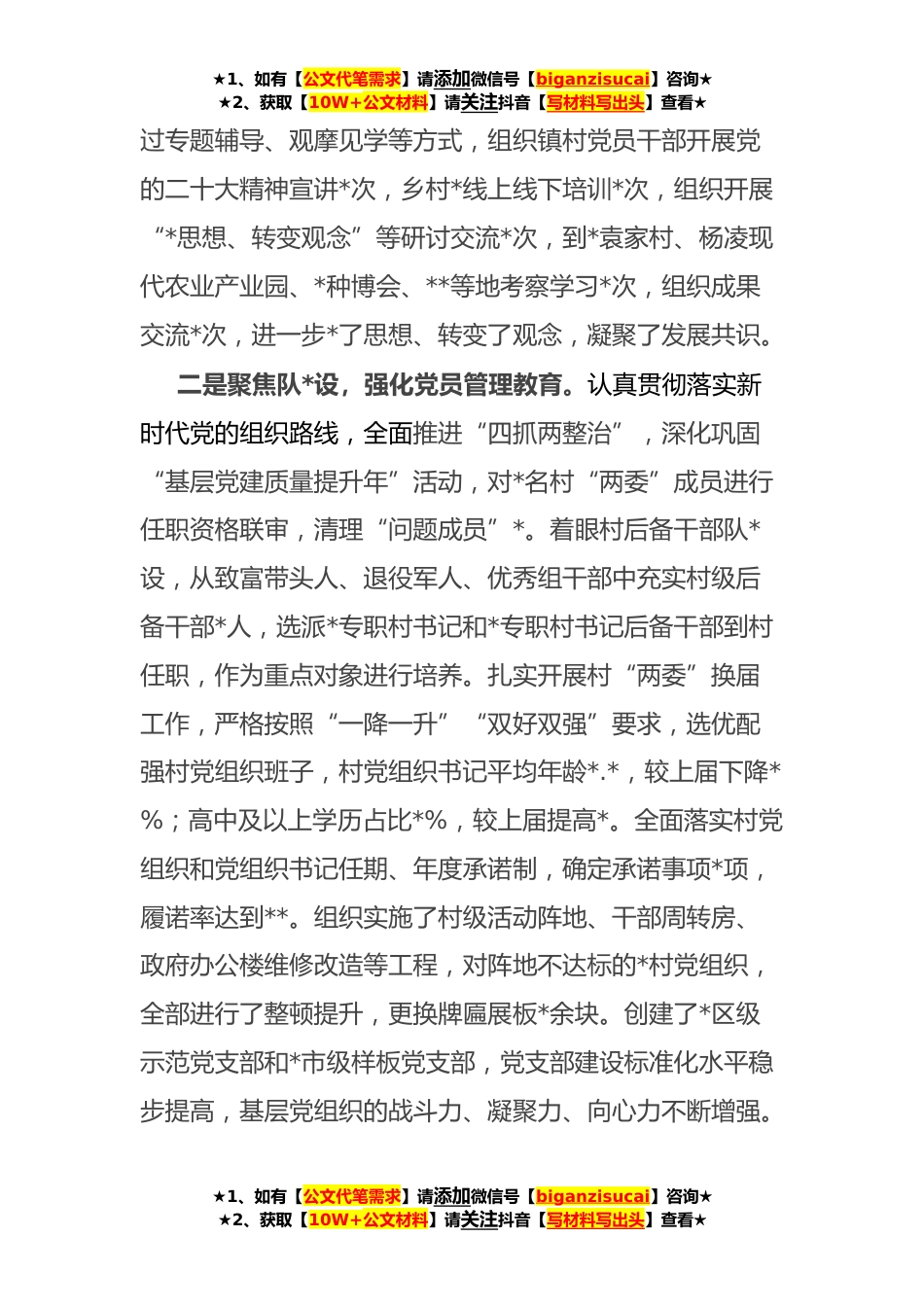 ★1、如有【公文代笔需求】请添加微信号【biganzisucai】咨询★★2、获取【10W+公文材料】请关注抖音【写材料写出头】查看★镇委书记抓党建述职报告根据会议安排,现将本人履行抓党建“第一责任人”情况报告如下:一、履职工作特点和亮点一是聚焦主责主业,认真履行主体责任。始终把政治领导、思想领导和组织领导贯穿于各项工作全过程,在把方向、谋大局、定政策、抓落实上用心用力。深入开展主题教育,结合全县冬季农村大学习大讨论大落实活动,督促引导领导班子和各村党组织抓实习近平新时代中国特色社会主义思想学习贯彻,以党的最新理论武装头脑指导工作。认真落实党建工作主体责任和第一责任人责任,年内主持召开党委会议*次,党建工作专题会议*,组织开展党建调研*,党建督查*次,为党员干部*课*,约谈村党...