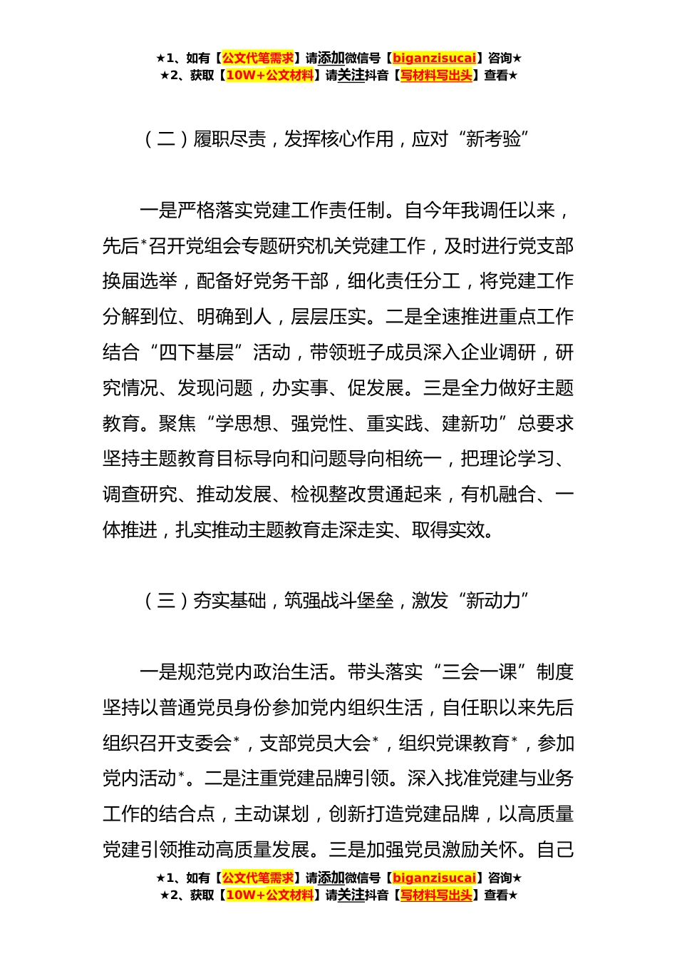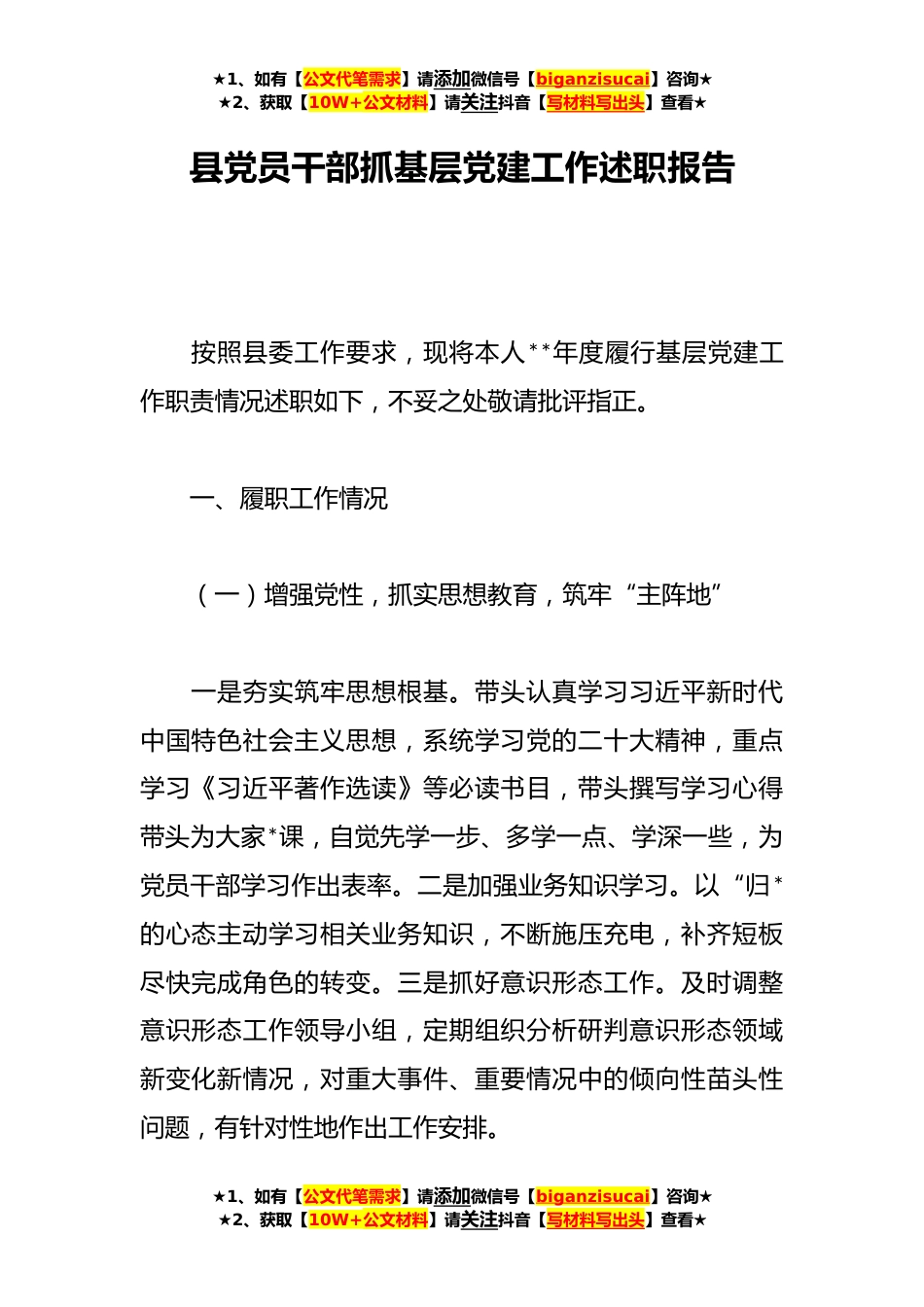 ★1、如有【公文代笔需求】请添加微信号【biganzisucai】咨询★★2、获取【10W+公文材料】请关注抖音【写材料写出头】查看★县党员干部抓基层党建工作述职报告按照县委工作要求,现将本人**年度履行基层党建工作职责情况述职如下,不妥之处敬请批评指正。一、履职工作情况(一)增强党性,抓实思想教育,筑牢“主阵地”一是夯实筑牢思想根基。带头认真学习习近平新时代中国特色社会主义思想,系统学习党的二十大精神,重点学习《习近平著作选读》等必读书目,带头撰写学习心得带头为大家*课,自觉先学一步、多学一点、学深一些,为党员干部学习作出表率。二是加强业务知识学习。以“归*的心态主动学习相关业务知识,不断施压充电,补齐短板尽快完成角色的转变。三是抓好意识形态工作。及时调整意识形态工作领导小...