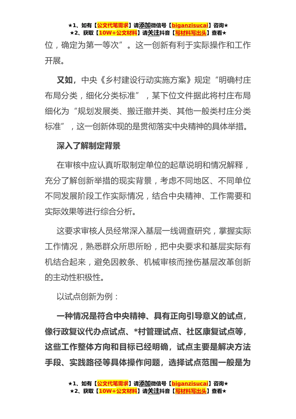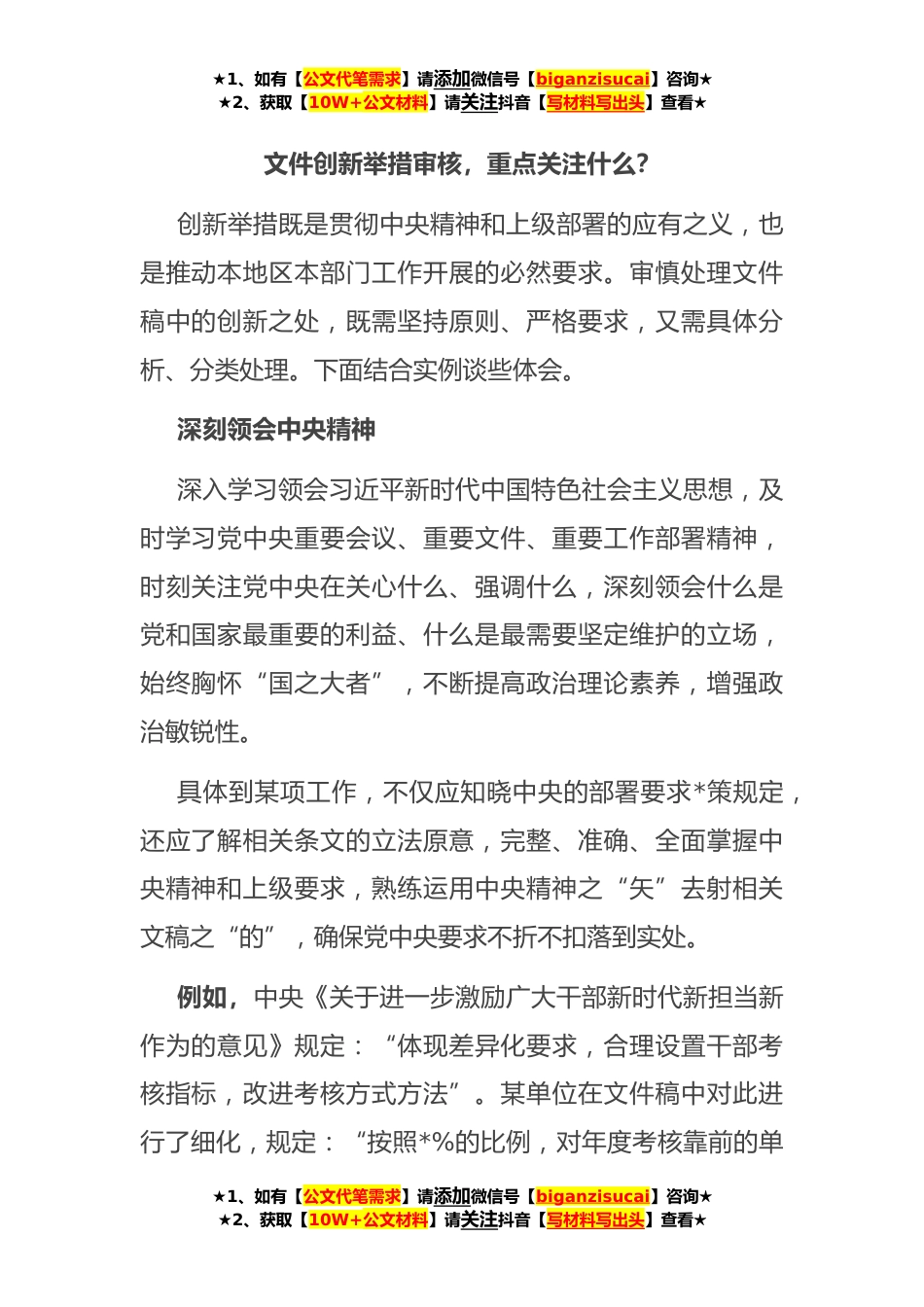 ★1、如有【公文代笔需求】请添加微信号【biganzisucai】咨询★★2、获取【10W+公文材料】请关注抖音【写材料写出头】查看★文件创新举措审核,重点关注什么?创新举措既是贯彻中央精神和上级部署的应有之义,也是推动本地区本部门工作开展的必然要求。审慎处理文件稿中的创新之处,既需坚持原则、严格要求,又需具体分析、分类处理。下面结合实例谈些体会。深刻领会中央精神深入学习领会习近平新时代中国特色社会主义思想,及时学习党中央重要会议、重要文件、重要工作部署精神,时刻关注党中央在关心什么、强调什么,深刻领会什么是党和国家最重要的利益、什么是最需要坚定维护的立场,始终胸怀“国之大者”,不断提高政治理论素养,增强政治敏锐性。具体到某项工作,不仅应知晓中央的部署要求*策规定,还应了解...