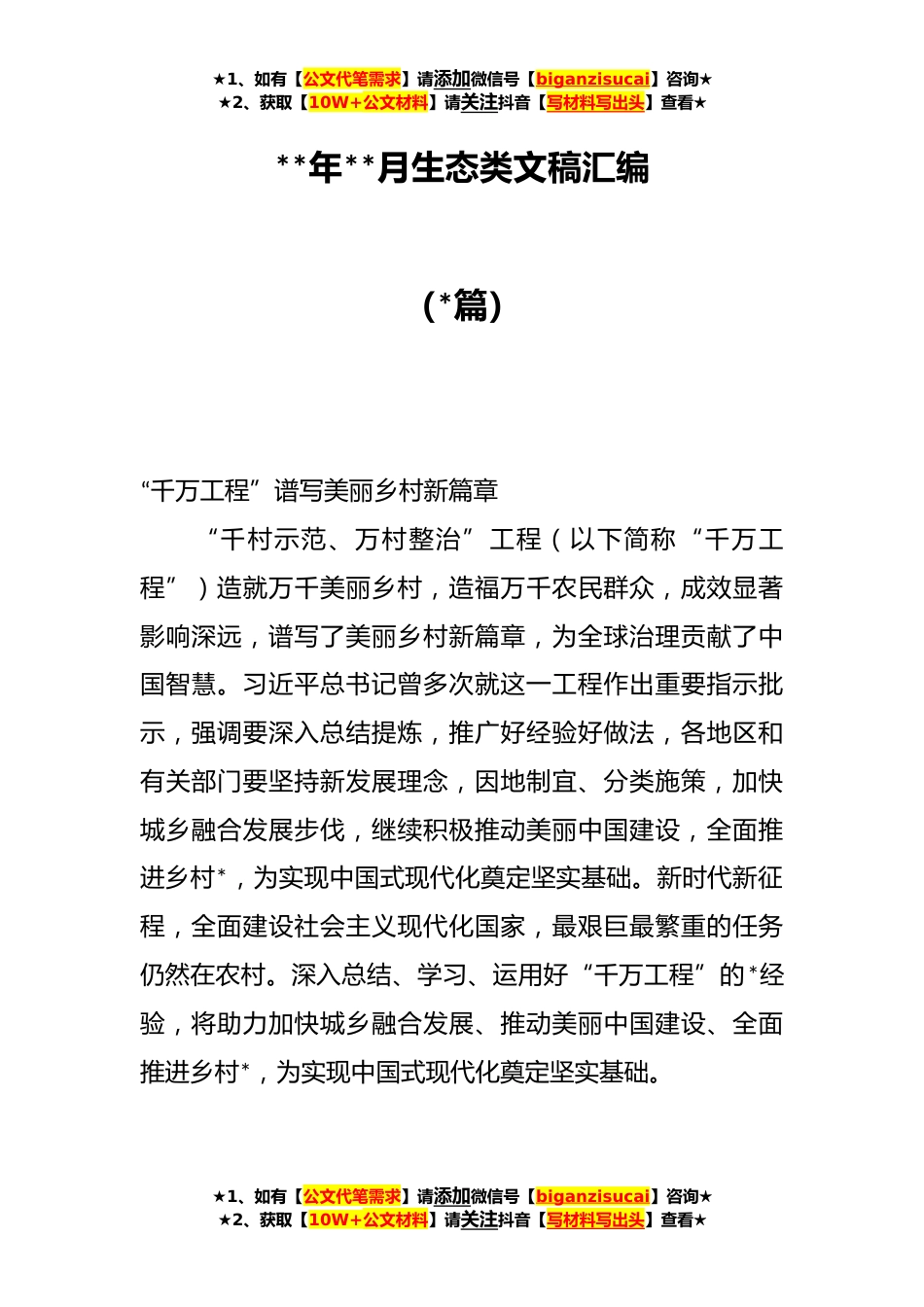 ★1、如有【公文代笔需求】请添加微信号【biganzisucai】咨询★★2、获取【10W+公文材料】请关注抖音【写材料写出头】查看★**年**月生态类文稿汇编(*篇)“千万工程”谱写美丽乡村新篇章“千村示范、万村整治”工程(以下简称“千万工程”)造就万千美丽乡村,造福万千农民群众,成效显著影响深远,谱写了美丽乡村新篇章,为全球治理贡献了中国智慧。习近平总书记曾多次就这一工程作出重要指示批示,强调要深入总结提炼,推广好经验好做法,各地区和有关部门要坚持新发展理念,因地制宜、分类施策,加快城乡融合发展步伐,继续积极推动美丽中国建设,全面推进乡村*,为实现中国式现代化奠定坚实基础。新时代新征程,全面建设社会主义现代化国家,最艰巨最繁重的任务仍然在农村。深入总结、学习、运用好“千万工...
