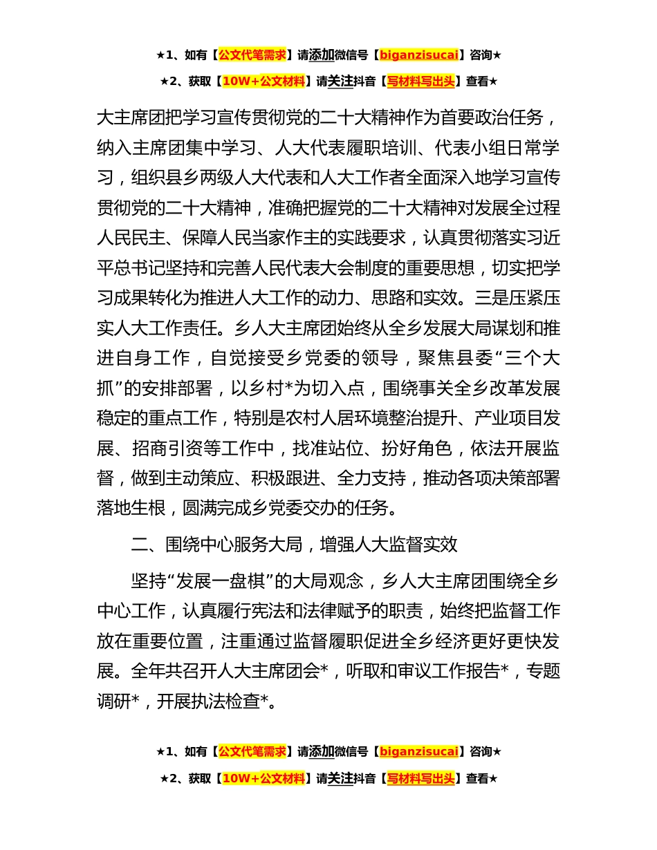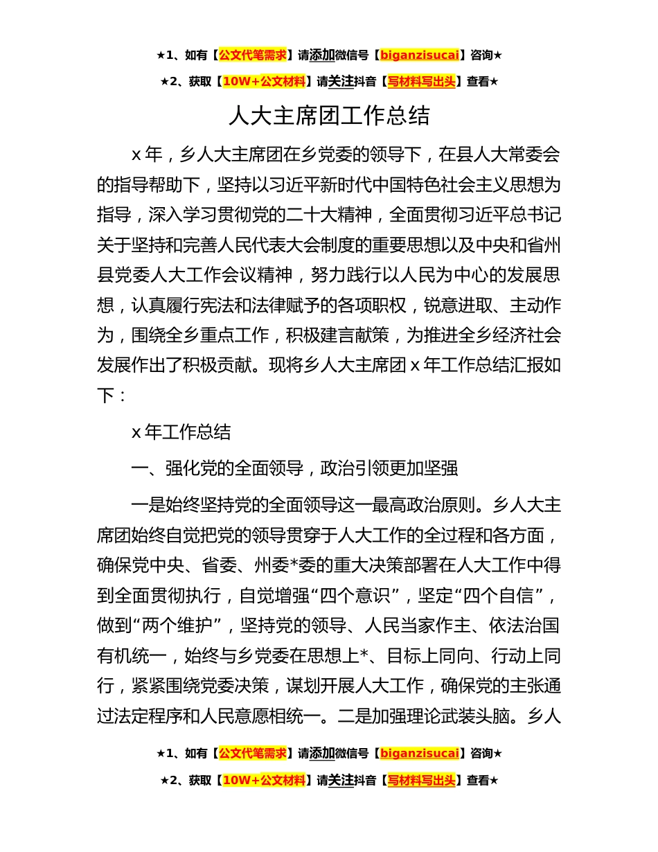 ★1、如有【公文代笔需求】请添加微信号【biganzisucai】咨询★★2、获取【10W+公文材料】请关注抖音【写材料写出头】查看★人大主席团工作总结x年,乡人大主席团在乡党委的领导下,在县人大常委会的指导帮助下,坚持以习近平新时代中国特色社会主义思想为指导,深入学习贯彻党的二十大精神,全面贯彻习近平总书记关于坚持和完善人民代表大会制度的重要思想以及中央和省州县党委人大工作会议精神,努力践行以人民为中心的发展思想,认真履行宪法和法律赋予的各项职权,锐意进取、主动作为,围绕全乡重点工作,积极建言献策,为推进全乡经济社会发展作出了积极贡献。现将乡人大主席团x年工作总结汇报如下:x年工作总结一、强化党的全面领导,政治引领更加坚强一是始终坚持党的全面领导这一最高政治原则。乡人大主席...