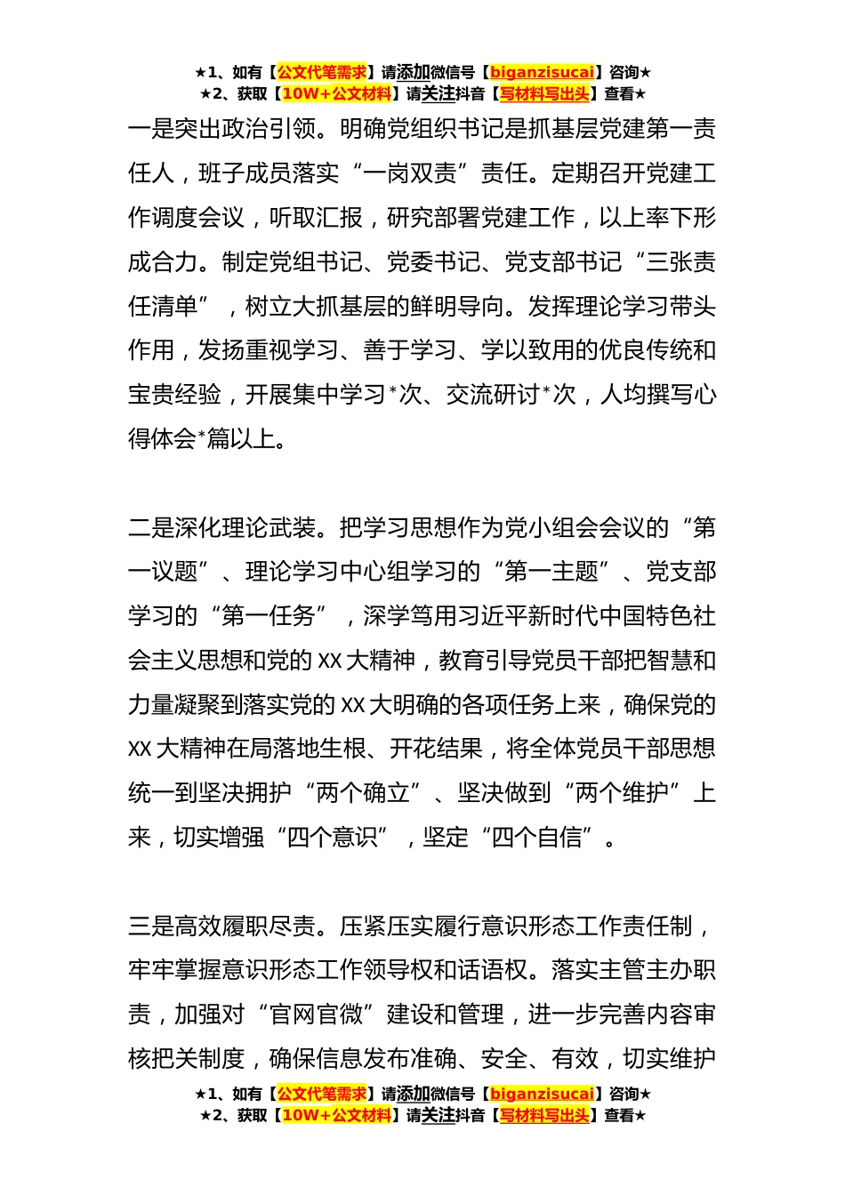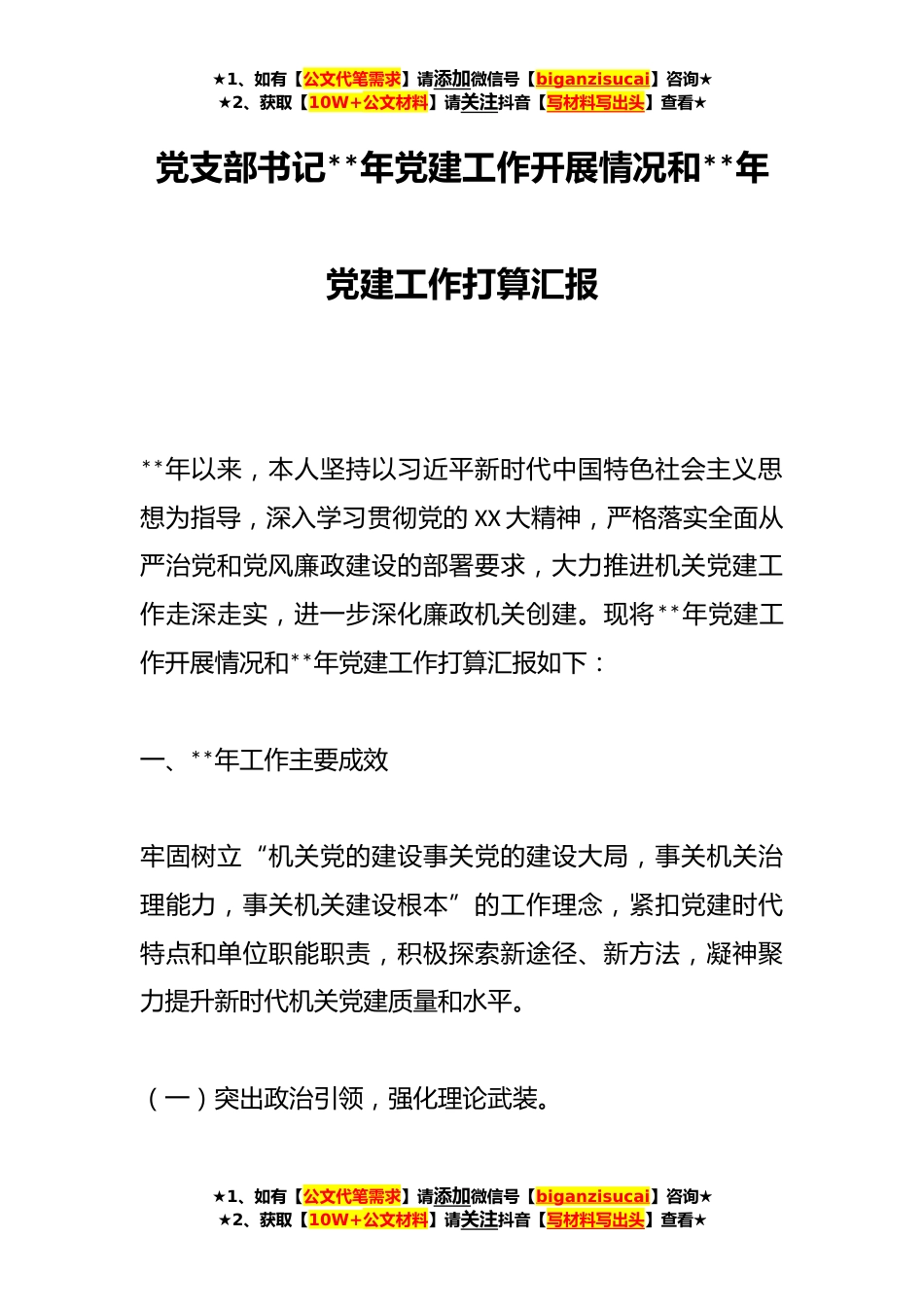 ★1、如有【公文代笔需求】请添加微信号【biganzisucai】咨询★★2、获取【10W+公文材料】请关注抖音【写材料写出头】查看★党支部书记**年党建工作开展情况和**年党建工作打算汇报**年以来,本人坚持以习近平新时代中国特色社会主义思想为指导,深入学习贯彻党的XX大精神,严格落实全面从严治党和党风廉政建设的部署要求,大力推进机关党建工作走深走实,进一步深化廉政机关创建。现将**年党建工作开展情况和**年党建工作打算汇报如下:一、**年工作主要成效牢固树立“机关党的建设事关党的建设大局,事关机关治理能力,事关机关建设根本”的工作理念,紧扣党建时代特点和单位职能职责,积极探索新途径、新方法,凝神聚力提升新时代机关党建质量和水平。(一)突出政治引领,强化理论武装。★1、如有【公文代笔需...