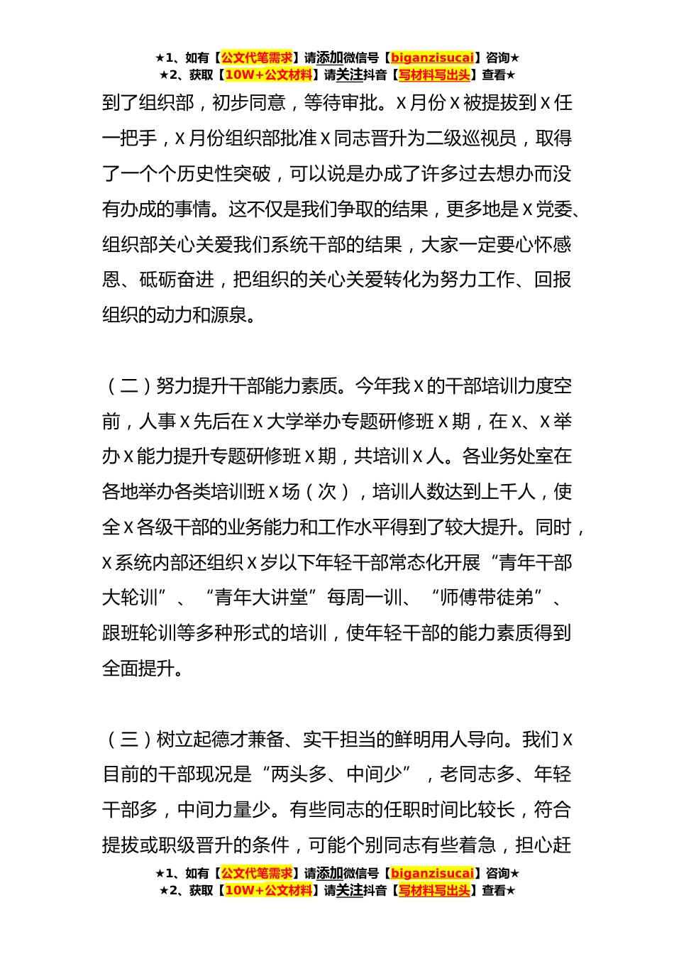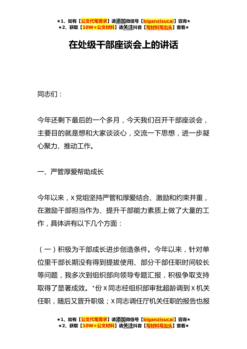★1、如有【公文代笔需求】请添加微信号【biganzisucai】咨询★★2、获取【10W+公文材料】请关注抖音【写材料写出头】查看★在处级干部座谈会上的讲话同志们:今年还剩下最后的一个多月,今天我们召开干部座谈会,主要目的就是想和大家谈谈心,交流一下思想,进一步凝心聚力、推动工作。一、严管厚爱帮助成长今年以来,X党组坚持严管和厚爱结合、激励和约束并重,在激励干部担当作为、提升干部能力素质上做了大量的工作,具体讲有以下几个方面:(一)积极为干部成长进步创造条件。今年以来,针对单位里干部长期没有得到提拔使用、部分干部任职时间较长等问题,我多次到组织部向领导专题汇报,积极争取支持取得了显著成效。*份X同志经组织部审批超龄调到X机关任职,随后又晋升职级;X同志调任厅机关任职的报告也报...