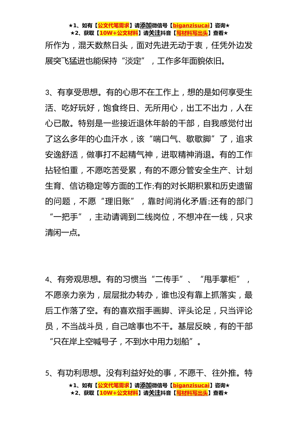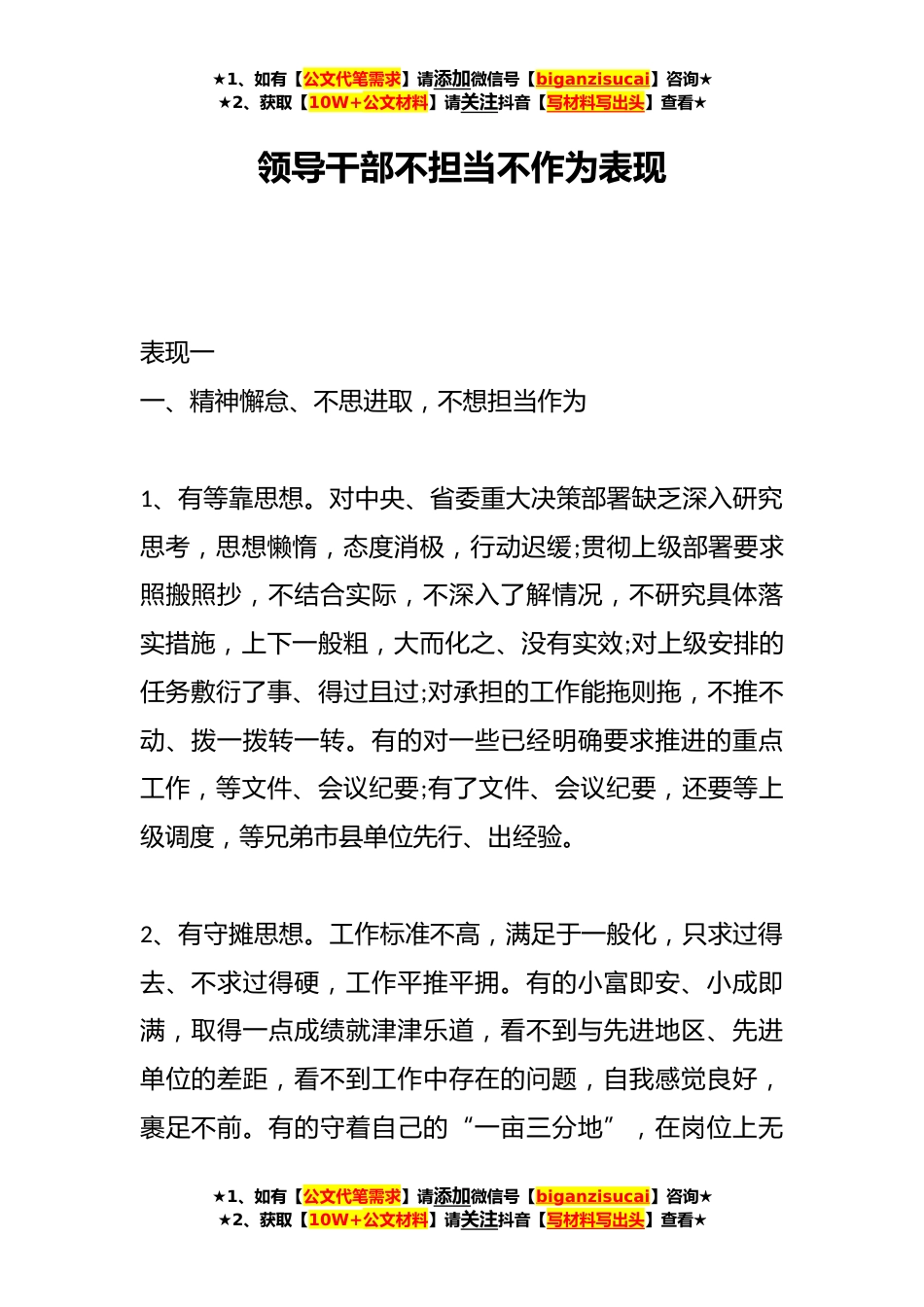 ★1、如有【公文代笔需求】请添加微信号【biganzisucai】咨询★★2、获取【10W+公文材料】请关注抖音【写材料写出头】查看★领导干部不担当不作为表现表现一一、精神懈怠、不思进取,不想担当作为1、有等靠思想。对中央、省委重大决策部署缺乏深入研究思考,思想懒惰,态度消极,行动迟缓;贯彻上级部署要求照搬照抄,不结合实际,不深入了解情况,不研究具体落实措施,上下一般粗,大而化之、没有实效;对上级安排的任务敷衍了事、得过且过;对承担的工作能拖则拖,不推不动、拨一拨转一转。有的对一些已经明确要求推进的重点工作,等文件、会议纪要;有了文件、会议纪要,还要等上级调度,等兄弟市县单位先行、出经验。2、有守摊思想。工作标准不高,满足于一般化,只求过得去、不求过得硬,工作平推平拥。有的小富...