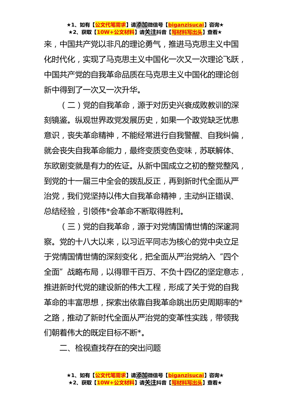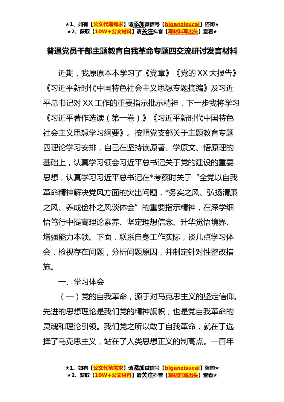 ★1、如有【公文代笔需求】请添加微信号【biganzisucai】咨询★★2、获取【10W+公文材料】请关注抖音【写材料写出头】查看★普通党员干部主题教育自我革命专题四交流研讨发言材料近期,我原原本本学习了《党章》《党的XX大报告》《习近平新时代中国特色社会主义思想专题摘编》及习近平总书记对XX工作的重要指示批示精神,下一步我将学习《习近平著作选读(第一卷)》《习近平新时代中国特色社会主义思想学习纲要》。按照党支部关于主题教育专题四理论学习安排,自己在坚持读原著、学原文、悟原理的基础上,认真学习领会习近平总书记关于党的建设的重要思想,认真学习习近平总书记在*考察时关于“全党以自我革命精神解决党风方面的突出问题,*务实之风、弘扬清廉之风、养成俭朴之风谈体会”的重要指示精神,在深学...