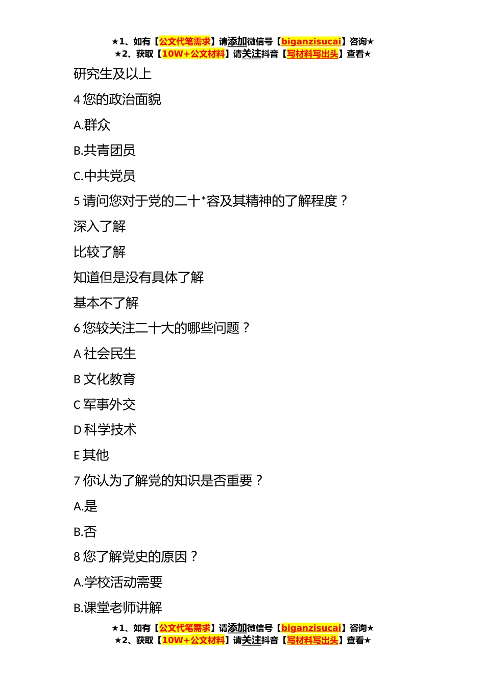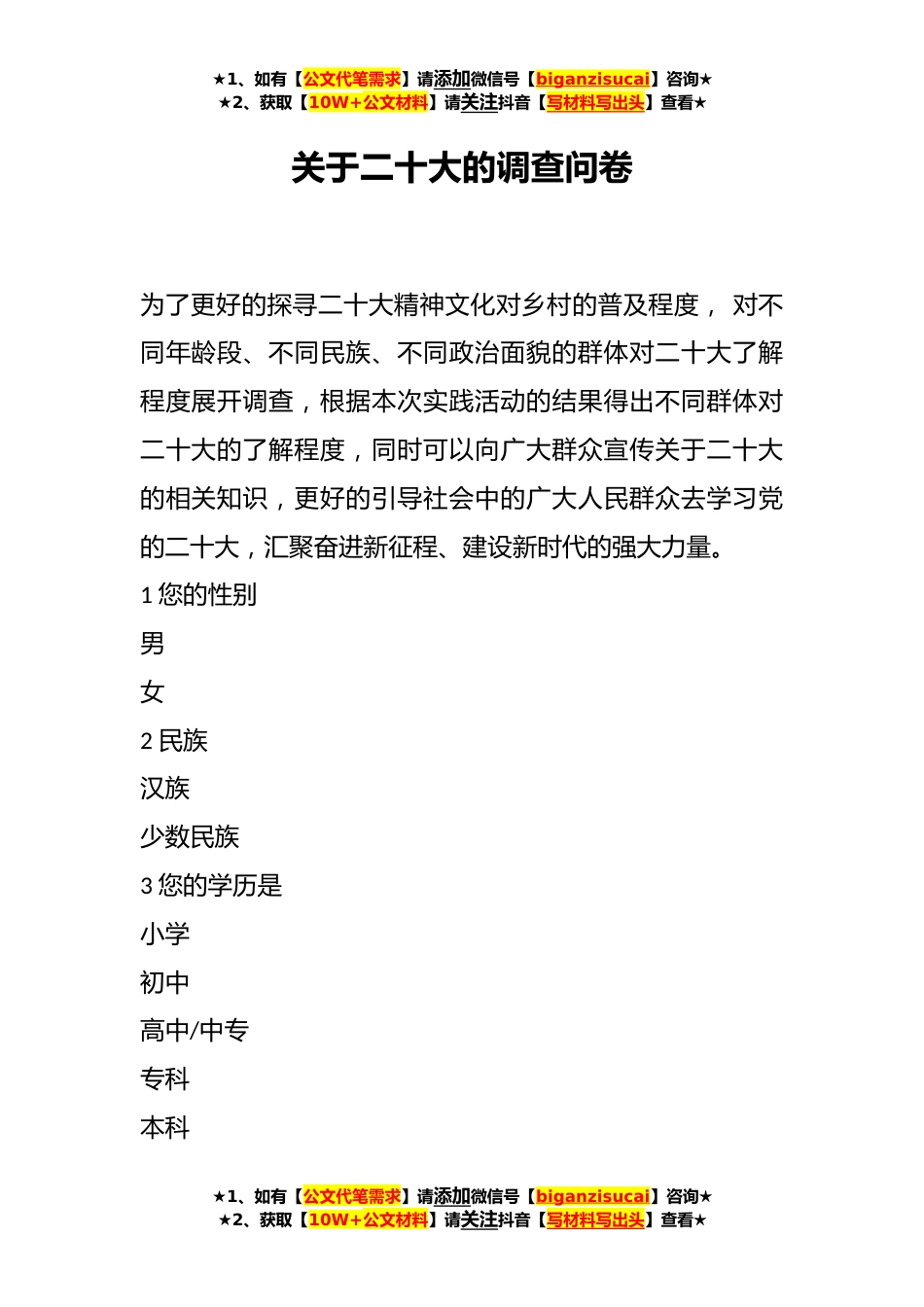 ★1、如有【公文代笔需求】请添加微信号【biganzisucai】咨询★★2、获取【10W+公文材料】请关注抖音【写材料写出头】查看★关于二十大的调查问卷为了更好的探寻二十大精神文化对乡村的普及程度,对不同年龄段、不同民族、不同政治面貌的群体对二十大了解程度展开调查,根据本次实践活动的结果得出不同群体对二十大的了解程度,同时可以向广大群众宣传关于二十大的相关知识,更好的引导社会中的广大人民群众去学习党的二十大,汇聚奋进新征程、建设新时代的强大力量。1您的性别男女2民族汉族少数民族3您的学历是小学初中高中/中专专科本科★1、如有【公文代笔需求】请添加微信号【biganzisucai】咨询★★2、获取【10W+公文材料】请关注抖音【写材料写出头】查看★★1、如有【公文代笔需求】请添加微信号【biganzis...