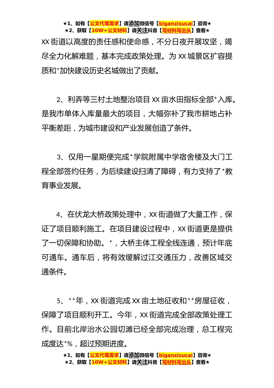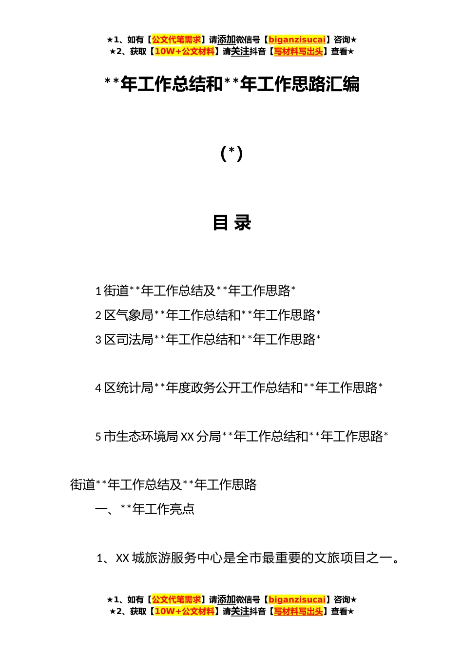 ★1、如有【公文代笔需求】请添加微信号【biganzisucai】咨询★★2、获取【10W+公文材料】请关注抖音【写材料写出头】查看★**年工作总结和**年工作思路汇编(*)目录1街道**年工作总结及**年工作思路*2区气象局**年工作总结和**年工作思路*3区司法局**年工作总结和**年工作思路*4区统计局**年度政务公开工作总结和**年工作思路*5市生态环境局XX分局**年工作总结和**年工作思路*街道**年工作总结及**年工作思路一、**年工作亮点1、XX城旅游服务中心是全市最重要的文旅项目之一。★1、如有【公文代笔需求】请添加微信号【biganzisucai】咨询★★2、获取【10W+公文材料】请关注抖音【写材料写出头】查看★★1、如有【公文代笔需求】请添加微信号【biganzisucai】咨询★★2、获取【10W+公文材料】请关注抖音【写材料...