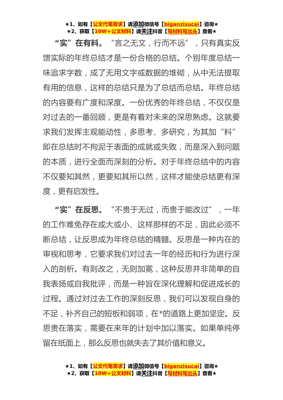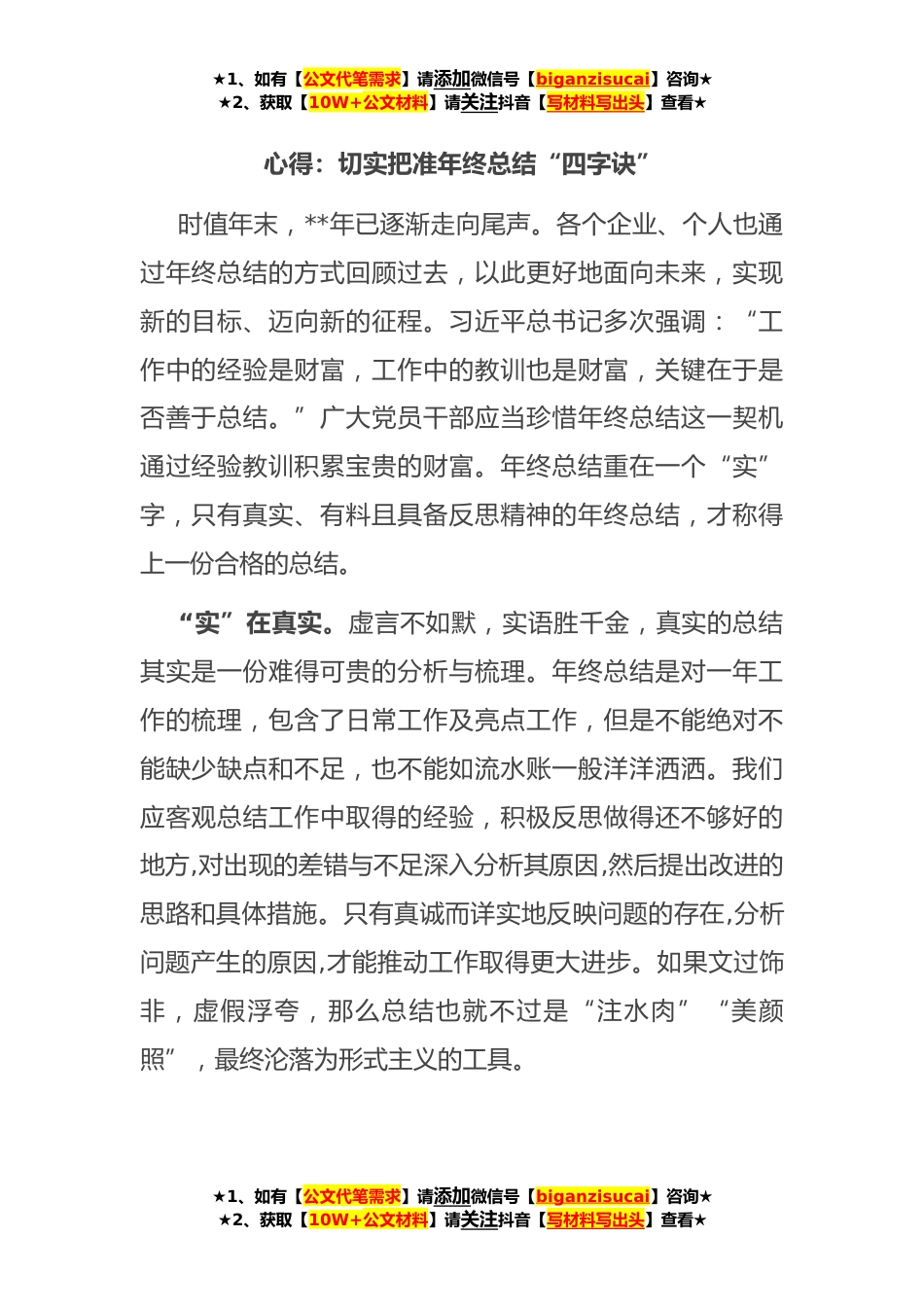 ★1、如有【公文代笔需求】请添加微信号【biganzisucai】咨询★★2、获取【10W+公文材料】请关注抖音【写材料写出头】查看★心得:切实把准年终总结“四字诀”时值年末,**年已逐渐走向尾声。各个企业、个人也通过年终总结的方式回顾过去,以此更好地面向未来,实现新的目标、迈向新的征程。习近平总书记多次强调:“工作中的经验是财富,工作中的教训也是财富,关键在于是否善于总结。”广大党员干部应当珍惜年终总结这一契机通过经验教训积累宝贵的财富。年终总结重在一个“实”字,只有真实、有料且具备反思精神的年终总结,才称得上一份合格的总结。“实”在真实。虚言不如默,实语胜千金,真实的总结其实是一份难得可贵的分析与梳理。年终总结是对一年工作的梳理,包含了日常工作及亮点工作,但是不能绝对不...