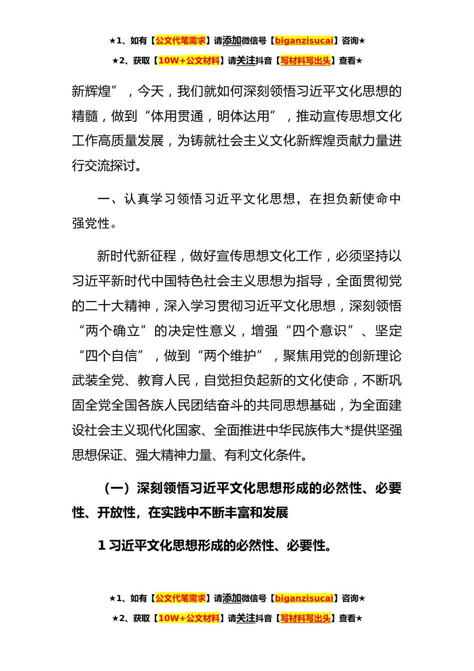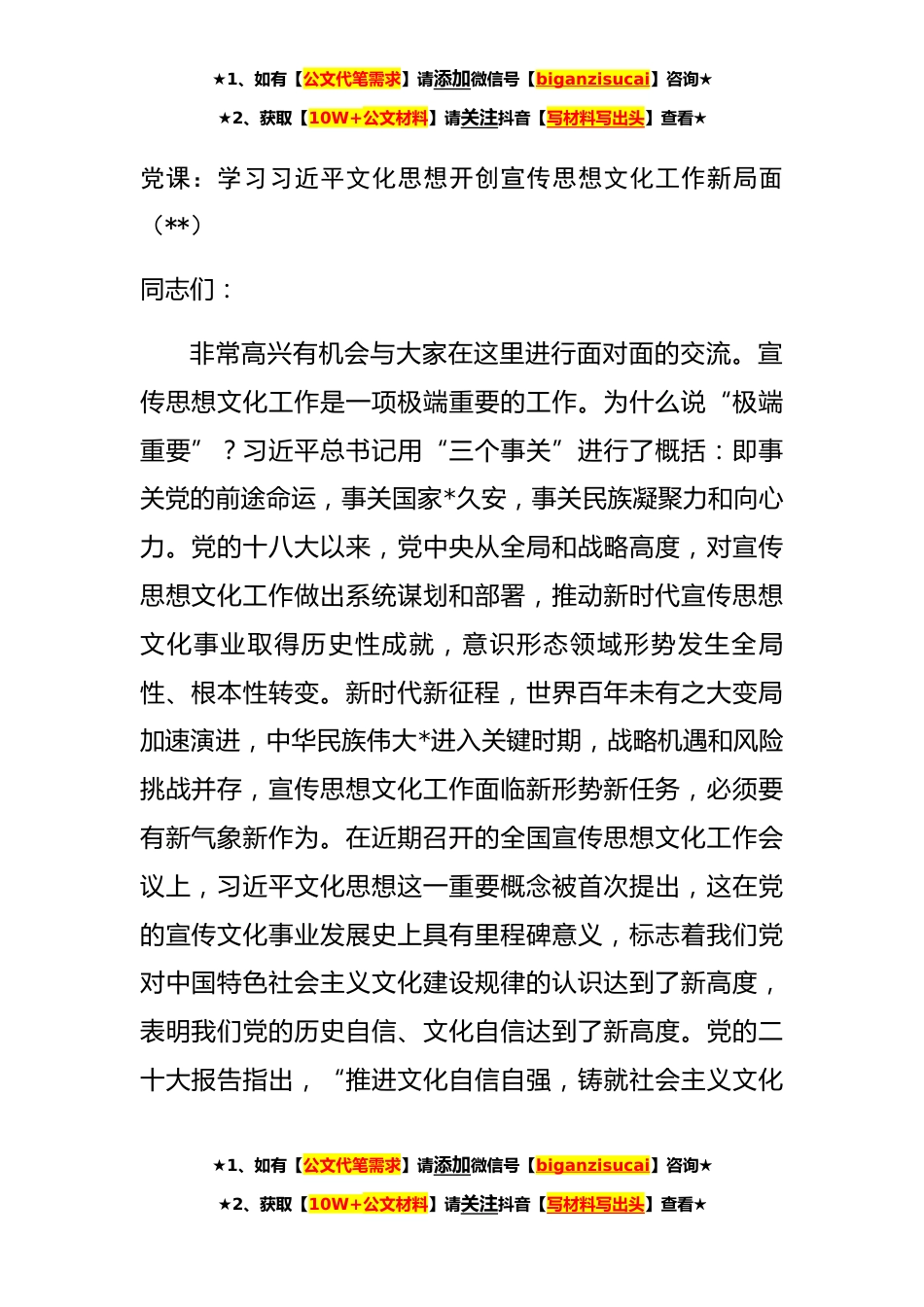 ★1、如有【公文代笔需求】请添加微信号【biganzisucai】咨询★★2、获取【10W+公文材料】请关注抖音【写材料写出头】查看★党课:学习习近平文化思想开创宣传思想文化工作新局面(**)同志们:非常高兴有机会与大家在这里进行面对面的交流。宣传思想文化工作是一项极端重要的工作。为什么说“极端重要”?习近平总书记用“三个事关”进行了概括:即事关党的前途命运,事关国家*久安,事关民族凝聚力和向心力。党的十八大以来,党中央从全局和战略高度,对宣传思想文化工作做出系统谋划和部署,推动新时代宣传思想文化事业取得历史性成就,意识形态领域形势发生全局性、根本性转变。新时代新征程,世界百年未有之大变局加速演进,中华民族伟大*进入关键时期,战略机遇和风险挑战并存,宣传思想文化工作面临新形势...