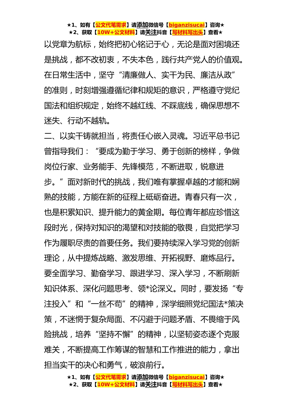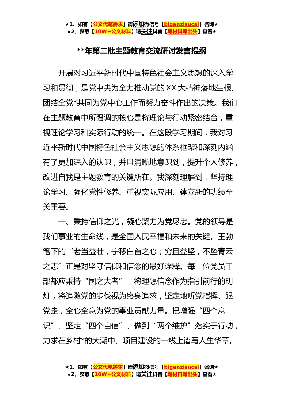 ★1、如有【公文代笔需求】请添加微信号【biganzisucai】咨询★★2、获取【10W+公文材料】请关注抖音【写材料写出头】查看★**年第二批主题教育交流研讨发言提纲开展对习近平新时代中国特色社会主义思想的深入学习和贯彻,是党中央为全力推动党的XX大精神落地生根、团结全党*共同为党中心工作而努力奋斗作出的决策。我们在主题教育中所强调的核心是将理论与行动紧密结合,重视理论学习和实际行动的统一。在这段学习期间,我对习近平新时代中国特色社会主义思想的体系框架和深刻内涵有了更加深入的认识,并且清晰地意识到,提升个人修养,改进自我是主题教育的关键所在。我深刻理解到,坚持理论学习、强化党性修养、重视实际应用、建立新的功绩至关重要。一、秉持信仰之光,凝心聚力为党尽忠。党的领导是我们事业的...