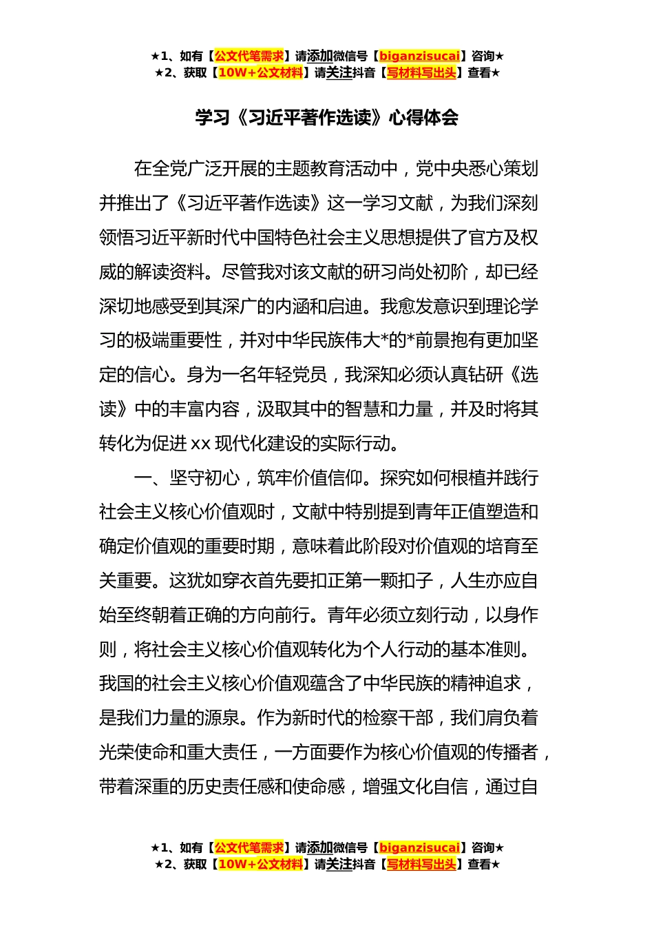 ★1、如有【公文代笔需求】请添加微信号【biganzisucai】咨询★★2、获取【10W+公文材料】请关注抖音【写材料写出头】查看★学习《习近平著作选读》心得体会在全党广泛开展的主题教育活动中,党中央悉心策划并推出了《习近平著作选读》这一学习文献,为我们深刻领悟习近平新时代中国特色社会主义思想提供了官方及权威的解读资料。尽管我对该文献的研习尚处初阶,却已经深切地感受到其深广的内涵和启迪。我愈发意识到理论学习的极端重要性,并对中华民族伟大*的*前景抱有更加坚定的信心。身为一名年轻党员,我深知必须认真钻研《选读》中的丰富内容,汲取其中的智慧和力量,并及时将其转化为促进xx现代化建设的实际行动。一、坚守初心,筑牢价值信仰。探究如何根植并践行社会主义核心价值观时,文献中特别提到青年...