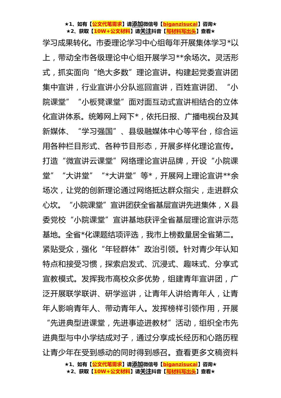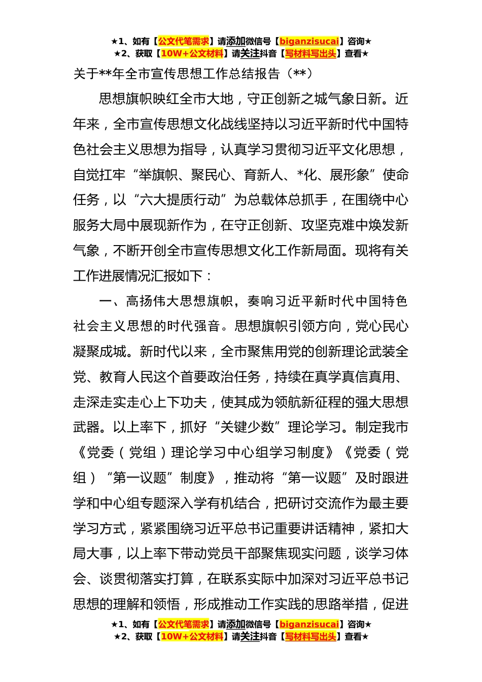 ★1、如有【公文代笔需求】请添加微信号【biganzisucai】咨询★★2、获取【10W+公文材料】请关注抖音【写材料写出头】查看★关于**年全市宣传思想工作总结报告(**)思想旗帜映红全市大地,守正创新之城气象日新。近年来,全市宣传思想文化战线坚持以习近平新时代中国特色社会主义思想为指导,认真学习贯彻习近平文化思想,自觉扛牢“举旗帜、聚民心、育新人、*化、展形象”使命任务,以“六大提质行动”为总载体总抓手,在围绕中心服务大局中展现新作为,在守正创新、攻坚克难中焕发新气象,不断开创全市宣传思想文化工作新局面。现将有关工作进展情况汇报如下:一、高扬伟大思想旗帜,奏响习近平新时代中国特色社会主义思想的时代强音。思想旗帜引领方向,党心民心凝聚成城。新时代以来,全市聚焦用党的创新理论...
